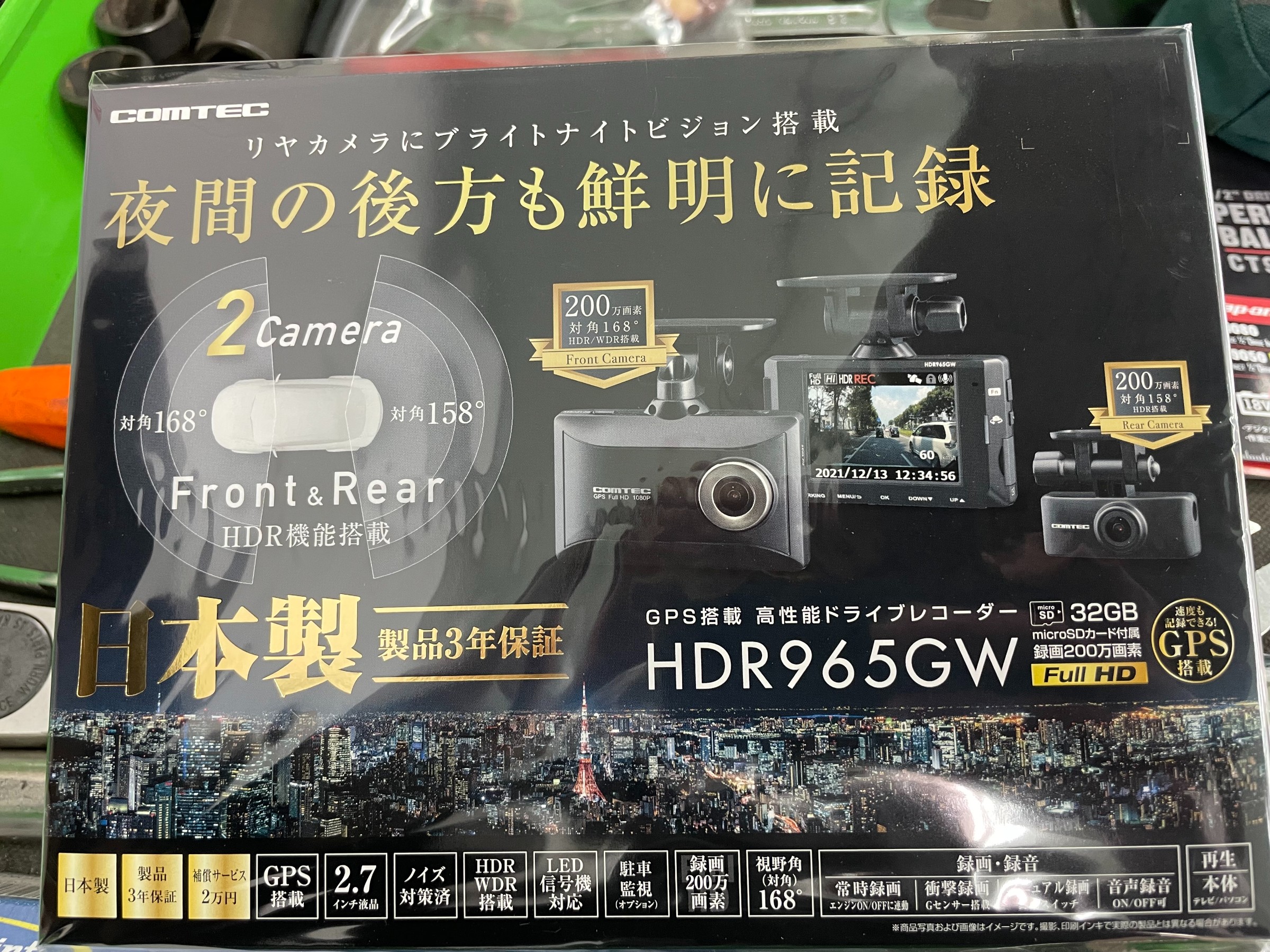 コムテック。安心の日本製、製品保証3年と機能も充実のHDR965GW。前後2カメラモデルです。