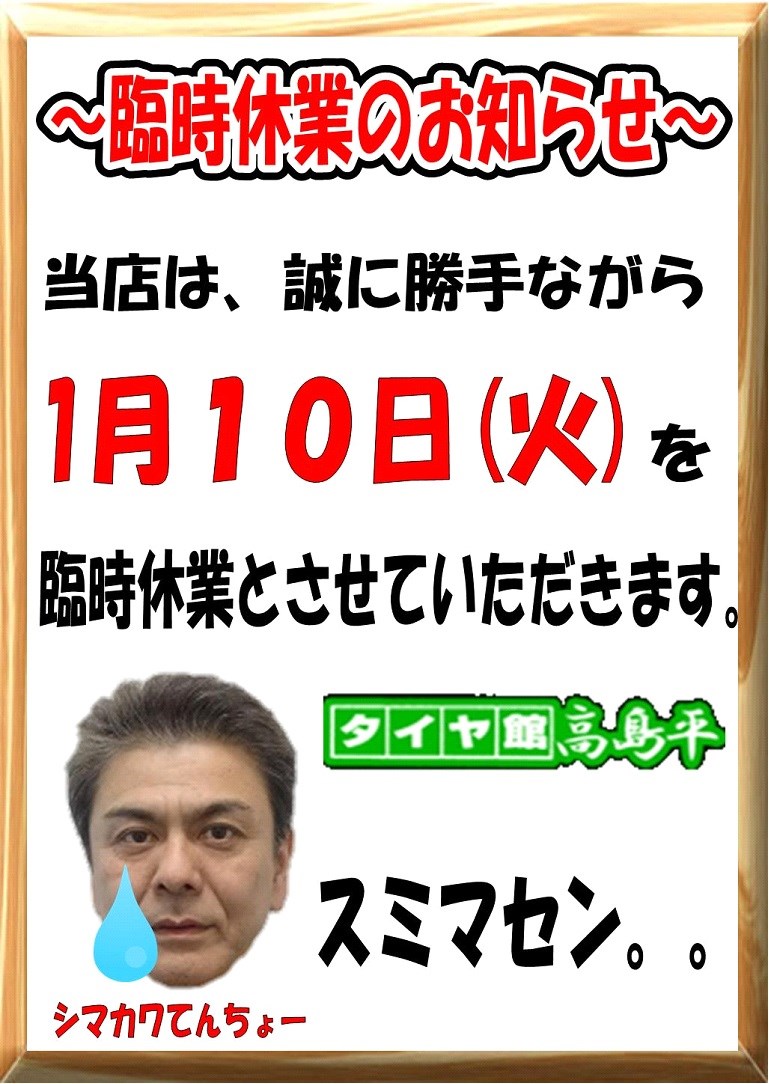 ~ 1月10日 ( 火 ) 臨時休業のお知らせ ~ ポスト 2017年1月6日 ~ 臨時休業のお知らせ ~ 当店は、誠に勝手ながら 1月10日 ( 火 ) を、社内研修の為 臨時休業とさせていただきます。 お客様には、大変ご不便・ご迷惑お掛けいたしますが 何卒、ご理解・ご協力の程よろしくお願いいたします。 なお、11日 ( 水 ) の定休日をはさみ 1月12日 ( 木 ) より通常営業とさせていただきますので よろしくお願いいたします。 タイヤ館高島平 カテゴリ:お知らせ