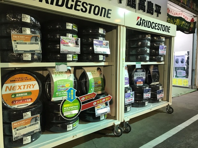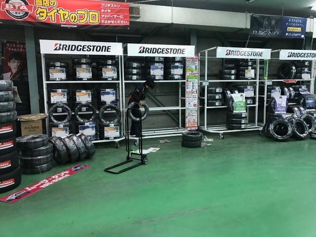 当店では外に展示しているタイヤはもちろんですが、PIT内のタイヤにもラッピングして