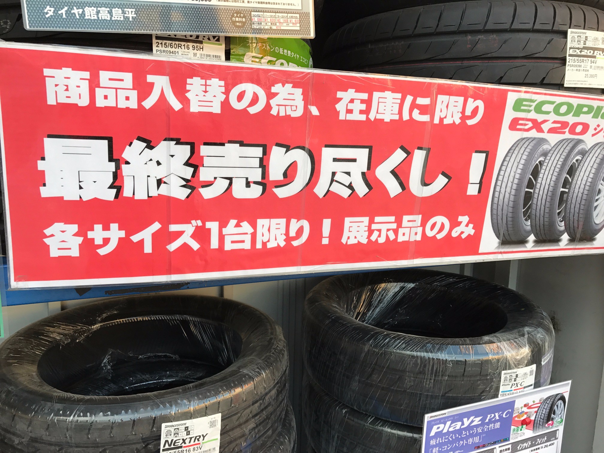 明日でセール最終日! ポスト 2017年3月11日 こんにちは!タイヤ館 高島平です 本日は天気も良く絶好のお出かけ日和でしたが 皆様、お車のメンテナンスはお済みでしょうか? 明日でセールも最終日となっておりますので、 ぜひお越しくださいませ。 モデルチェンジした夏タイヤや、スタッドレスタイヤも 在庫処分価格にて販売いたしております。 担当:フナミズ
