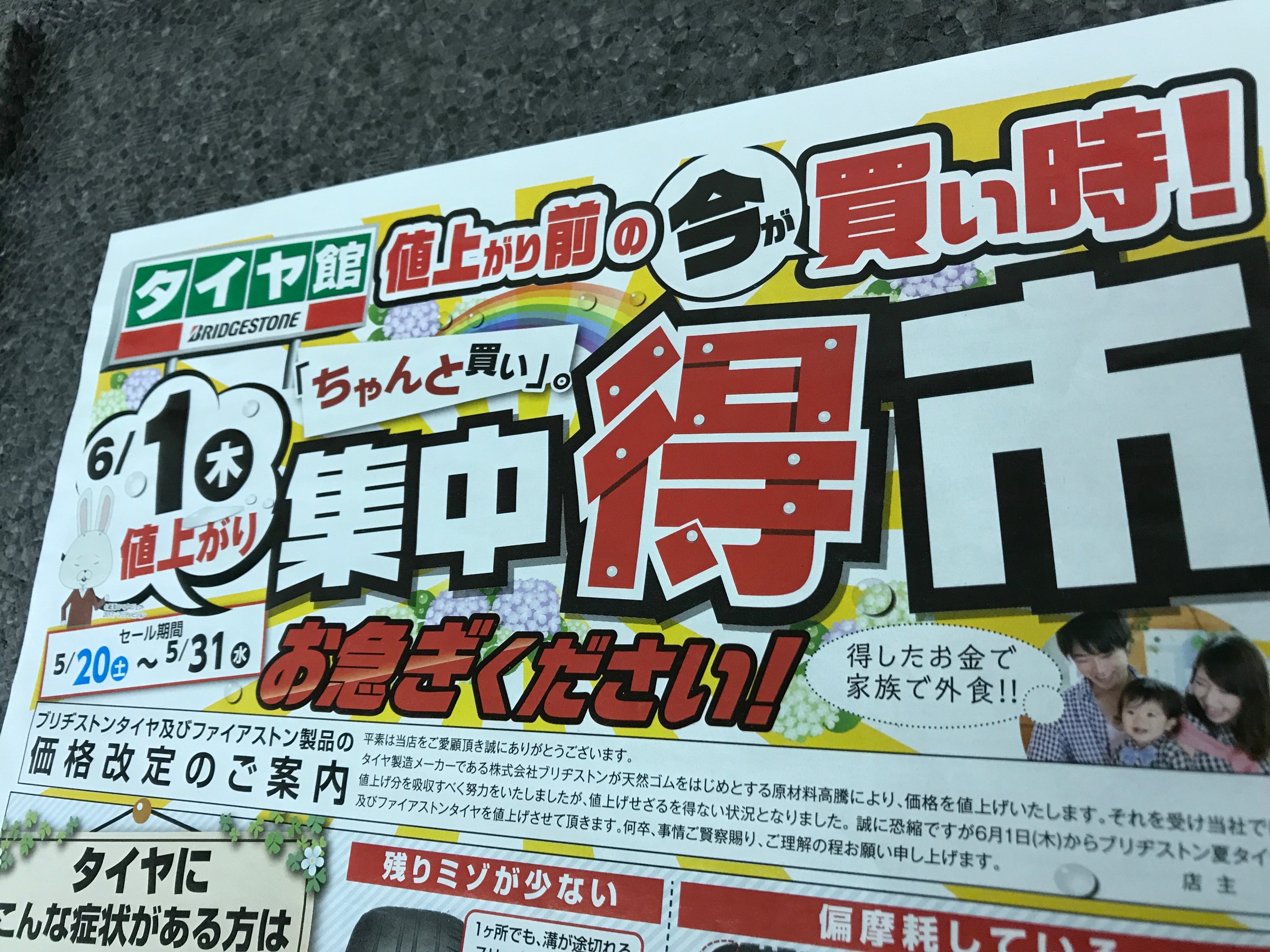 タイヤ値上がり直前! ポスト 2017年5月29日 こんにちは。 副店長の萩原です。 とうとう6/1からのタイヤ値上がりが迫ってまいりました。 コチラのお客様も当店からのお知らせをご覧いただいて、タイヤ交換にお越し下さいました! マダマダ『集中得市』も開催中です。 値上がり直前日の31日(水)は当店定休日を頂いてしまいますが・・・ m(_ _)m タイヤ交換をご検討されている方は、是非この機会をお見逃し無く。 担当:ハギワラ