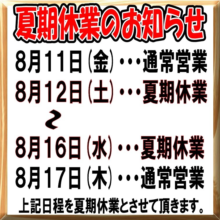 お盆休みのお知らせ ポスト 2017年8月12日 こんにちはスタッフの船水です。 皆さんは夏休みをどうお過ごしでしょうか? 当店も誠に勝手ながら明日12日(土曜日)から16日(水曜日)までお盆休みになります。 17日からは通常営業になりますのでご理解の程お願い申し上げます。 ちなみに本日はピットに空きがございますのでまだお出掛けしてない方は お出掛け前に点検やオイル交換はいかがでしょうか? #夏季休業 #プレミアムセール #タイヤ館 #高島平 #タイヤ #ブリヂストン #板橋区 #練馬区 #和光市 #戸田市 当店・当グループでは新規採用社員募集中です! 詳しくはコチラ⤵︎⤵︎⤵︎ 『タイヤ館高島平』で検索! 担当:イシジマ