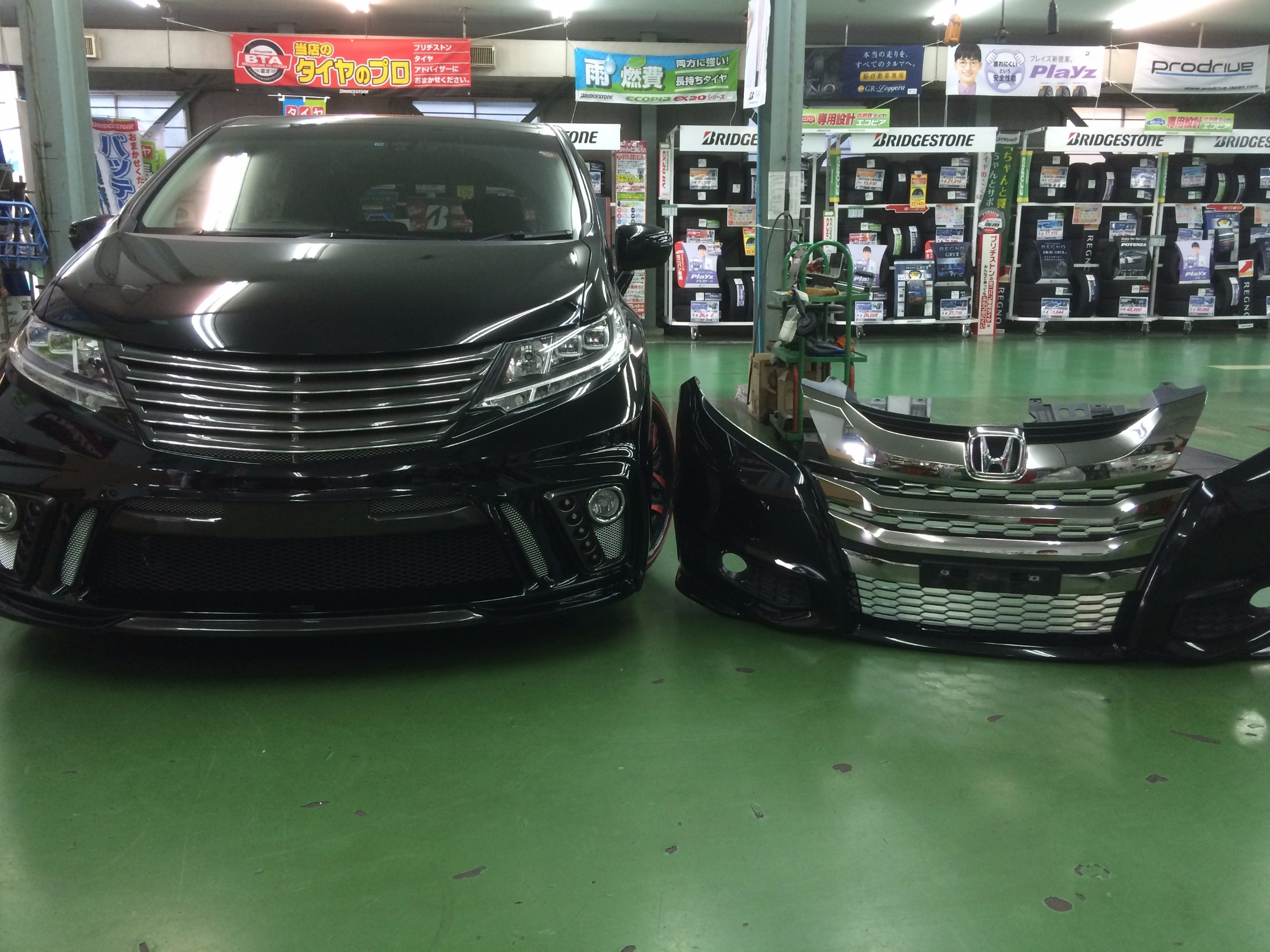 エアロ交換・お取り付け。 ポスト 2017年9月7日 こんにちは。 副店長の萩原です。 本日はオデッセイ・アブソルートのエアロパーツ交換・お取り付けを行ないました。 シルクブレイズさんのフロントバンパーと、写真忘れてしまいましたがサイドパネルの交換です。 フォグランプ脇の4連LEDと一部グレー色の塗り分けが目を引きます。 beforeを撮ってなかった為、外した純正バンパーとの比較です。 後日にリアバンパーとリアウイングも取り付け予定です。 担当:ハギワラ