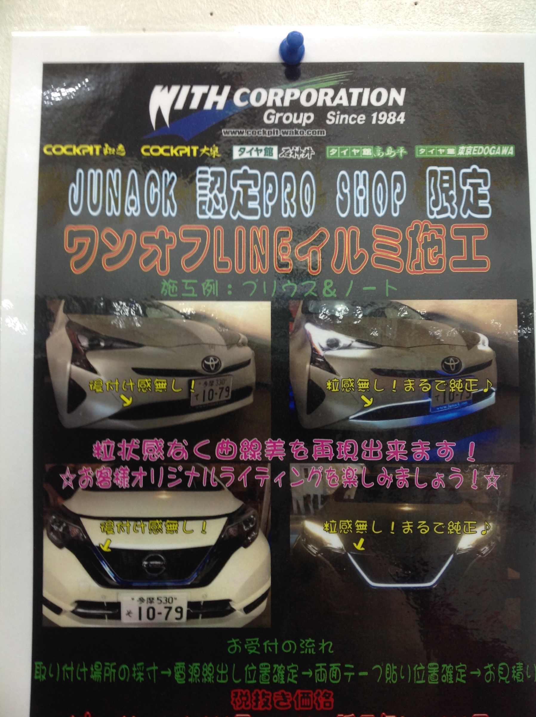 ジュナック限定商品 取扱開始! ポスト 2018年5月7日 こんばんは!本日はジュナックさんで認められた店舗だけ でしか販売していないワンオフLINEイルミ施工をご紹介 致します。 今までも、LEDのテープはありましたが粒感がどうしても 残っていました。 しかしこちらはご覧のように純正のようにLINEで発光するので 今までは付けれなかったような場所にも取付けが可能になり、 長さも自由に決められるので、お好みの長さで施工する事が可能です! 是非一度お見積もりを~)^o^( 担当:フナミズ
