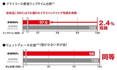 高剛性ハンドリングシート、S007A専用サイド補強、S007A専用コンパウンドを採用することでドライ路面でのハンドリング性能の向上!!