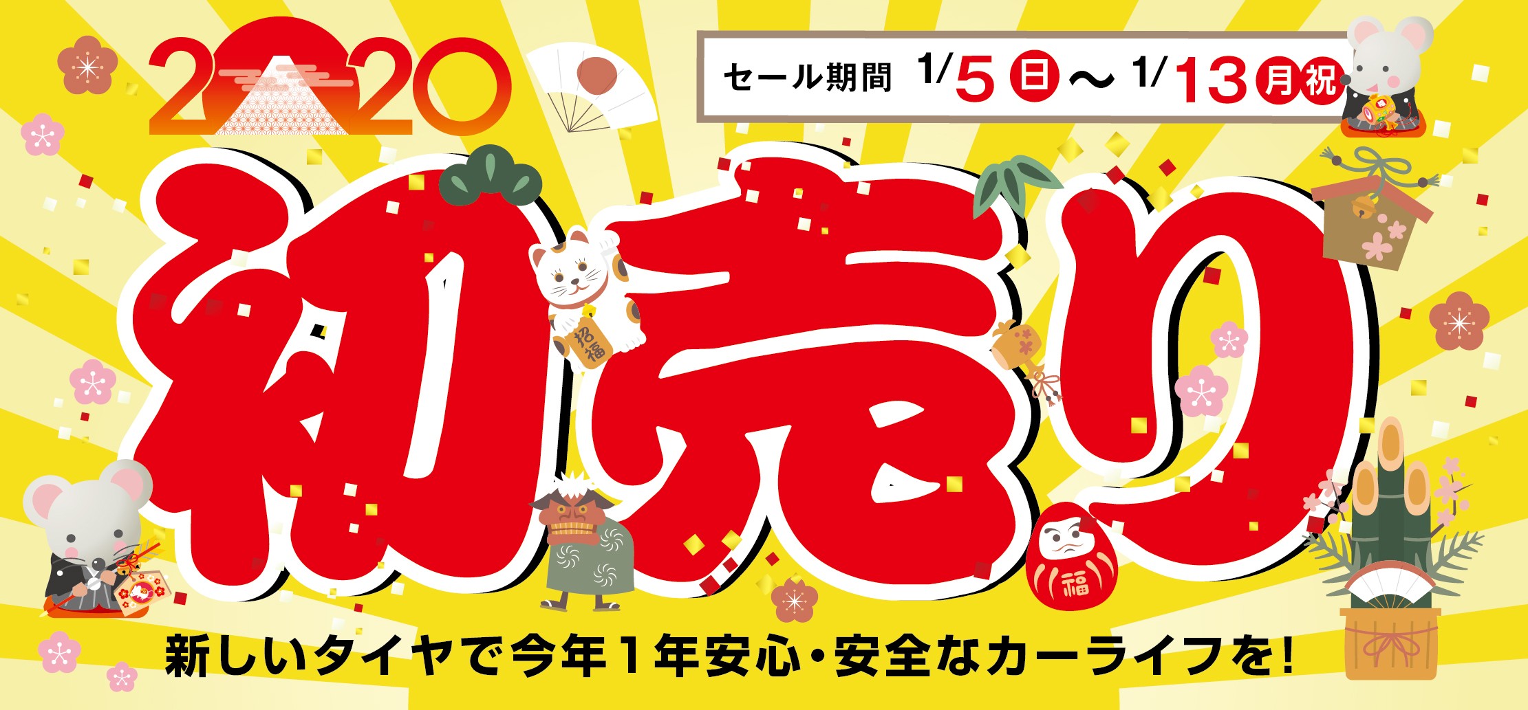 新春 初売りセール開催! ポスト 2020年1月5日 謹賀新年 明けましておめでとうございます。 旧年中はご愛顧をあずかり誠に有難うございました。 本年も一層のサービス向上を目指し、社員一同誠心誠意努めてまいりますので 何卒本年も倍旧のご支援の程お願い申し上げます。 1/5(日)~1/13(月・祝)の期間 新春 初売りセールを開催いたします。 お年玉価格のタイヤなどや、 プレゼントも沢山ご用意して皆様の御来店お待ち致しておりますので ご家族そろってお越しくださいませ。 担当:フナミズ
