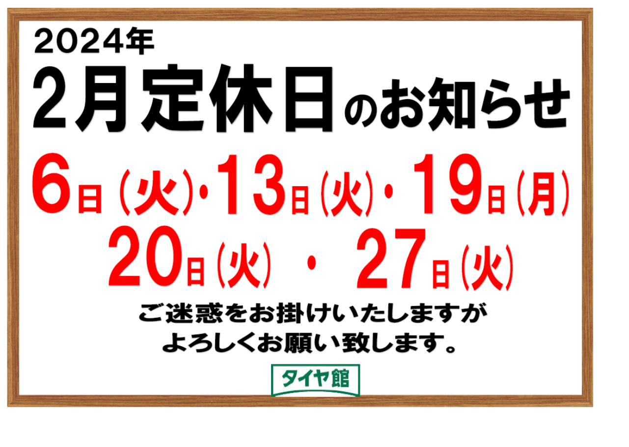 2月定休日のご案内 ポスト 2024年1月29日 いつもお世話になっております。 タイヤ館高津です。 2月の定休日のご案内です。 2月の定休日は火曜日と19日の月曜日です。 19日月曜日は変則の休みとなりますが何卒宜しくお願い致します。 ご迷惑をおかけいたしますが よろしくお願い致します。 カテゴリ:お知らせ
