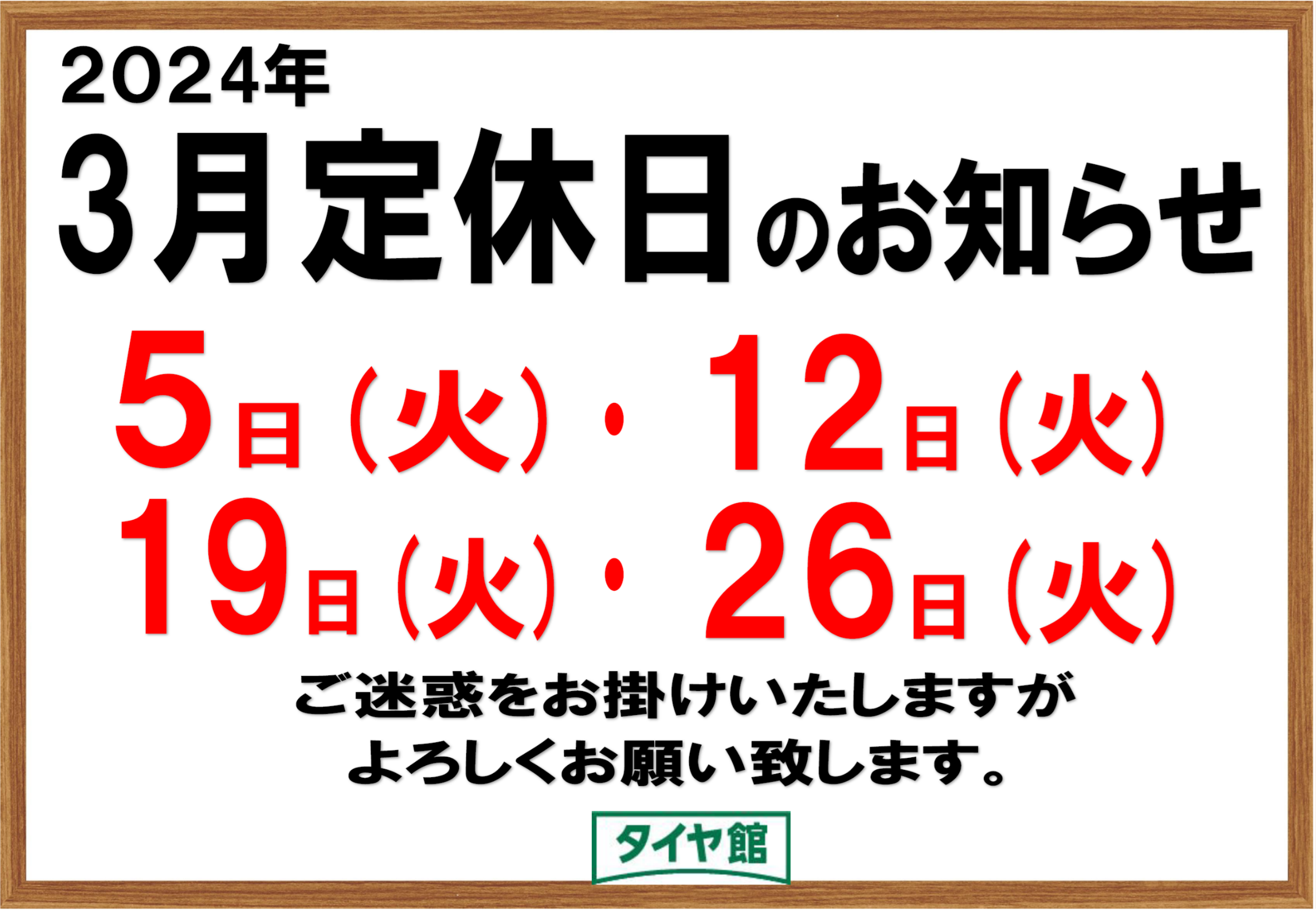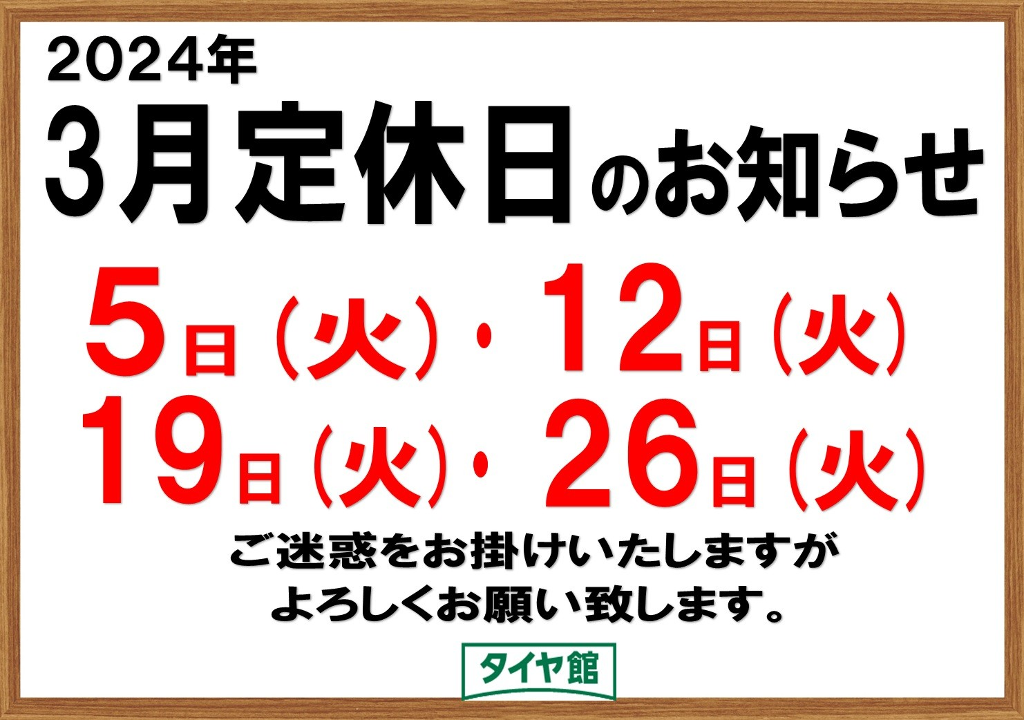 3月定休日のご案内 ポスト 2024年2月29日 いつもお世話になっております。 3月定休日のが案内です。 3月の定休日は火曜日となります。 ご迷惑をお掛け致しますが 何卒宜しくお願い致します。 カテゴリ:お知らせ