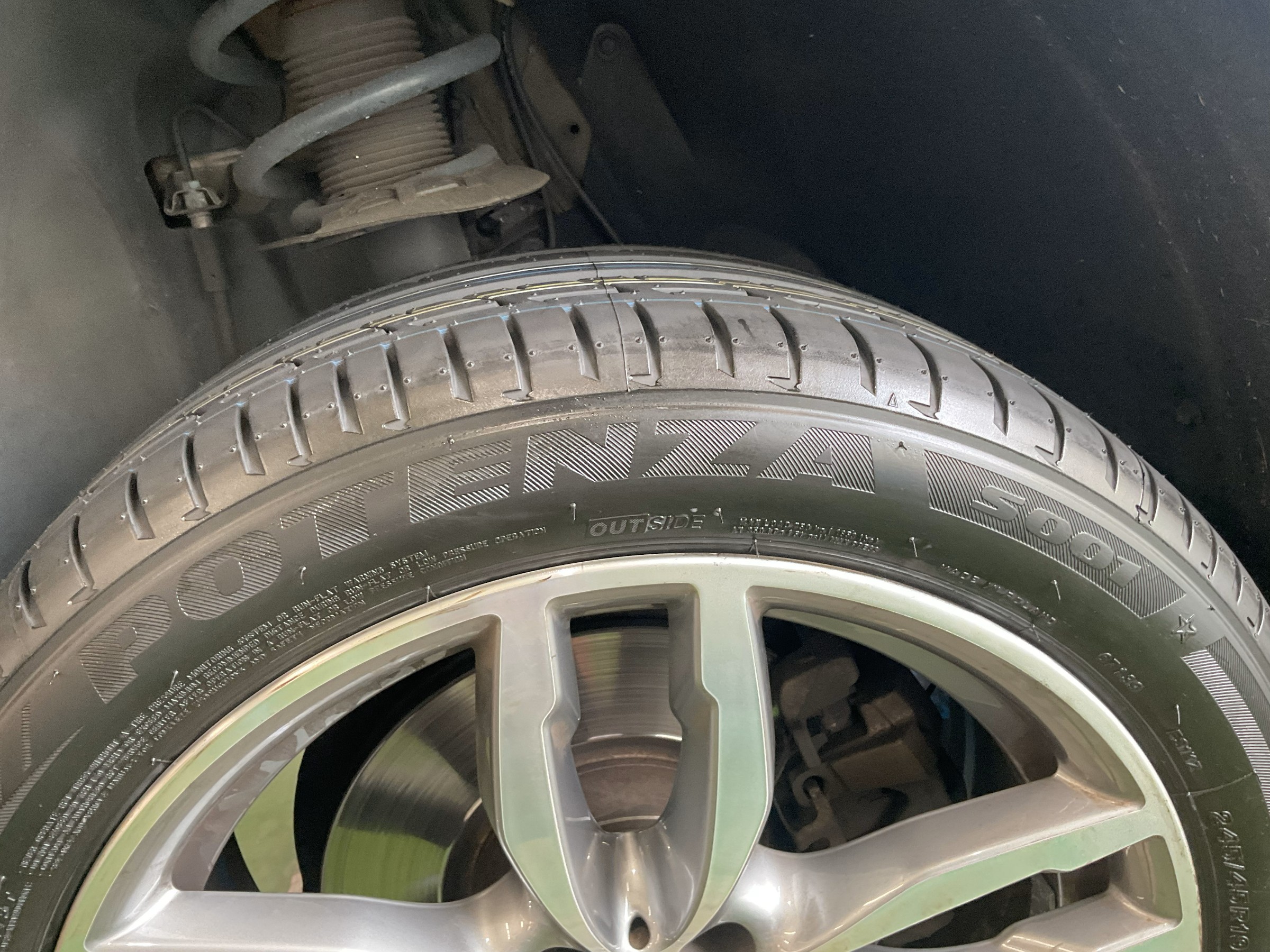パンクしても速度80km/hで80km走行できるランフラットテクノロジー採用タイヤ「POTENZA S001 RFT(ポテンザ エス・ゼロ・ゼロ・ワン アールエフティー)」です。お客さまのおクルマにはこれまでもランフラットタイヤが装着されていましたので、今回もランフラットタイヤをお選びいただきました。