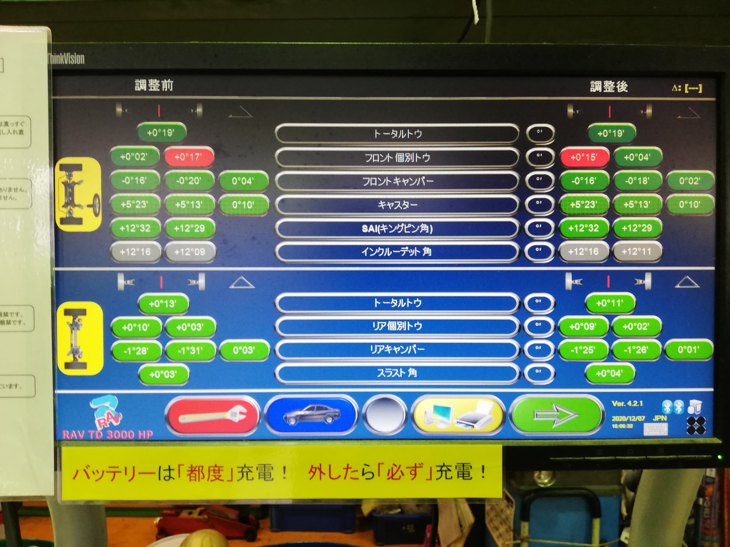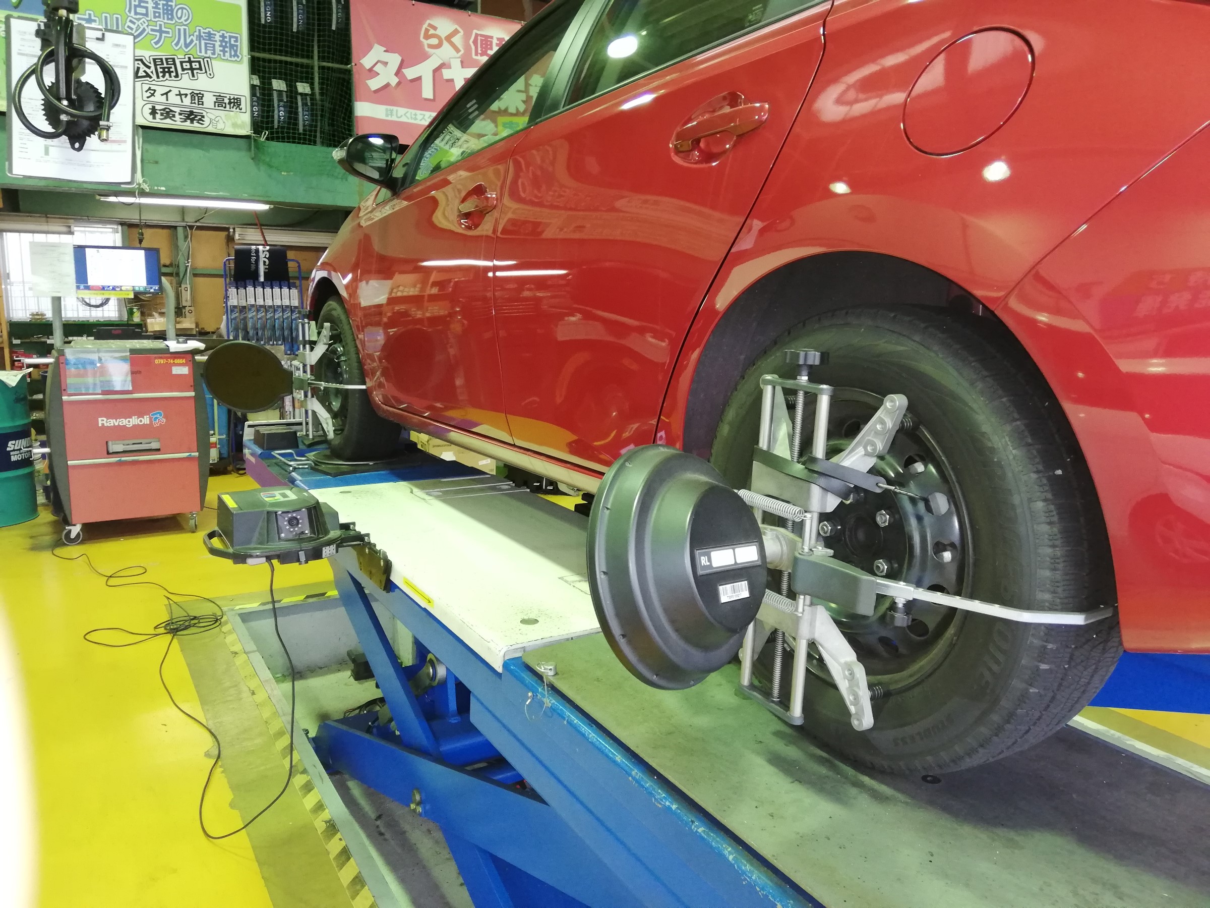 専用の器具を各タイヤに取り付け測定し、必要であれば調整を車の骨盤矯正をします。