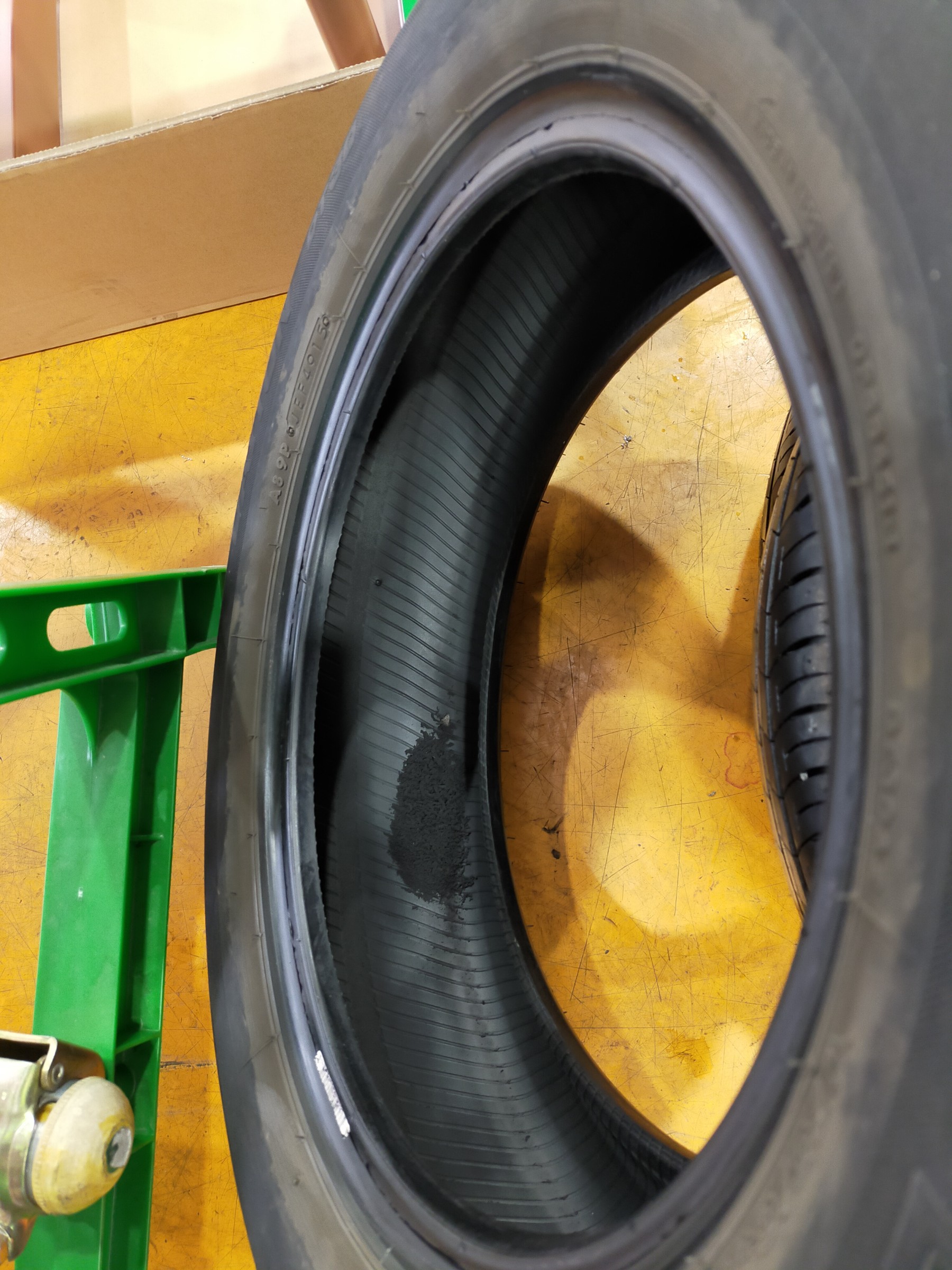 上記のタイヤは空気圧不足←パンクなどで引きずってしまったタイヤです。こうなると修理でエアー漏れが止まっても超危険です。