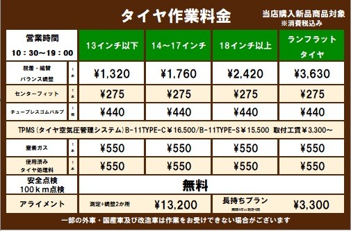 ※上記価格には作業工賃及び用済みタイヤ処理費用は含まれていません。
