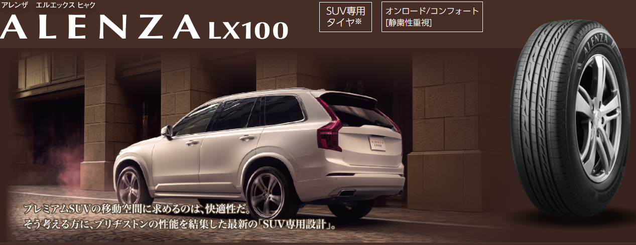 ↑ 快適性を追求し最上の快適性 を提供してくれる SUV専用タイヤ「ALENZA LX100」