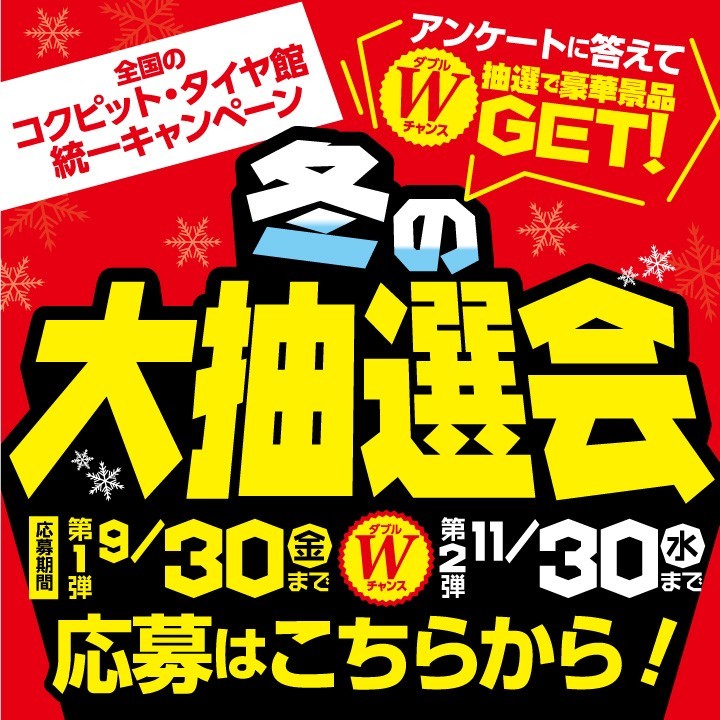 【冬の大抽選会】参加するだけで500円オフクーポンプレゼント!! ポスト 2022年9月1日 冬の大抽選会開催中です♪ アプリトップ画面内、『おすすめ・ピックアップ情報』から 抽選に参加していただきますと、翌日17時以降に500円オフクーポンが届きます 冬の脱着にもご利用いただけるクーポンですので よろしければご参加ください♪ 担当:西下