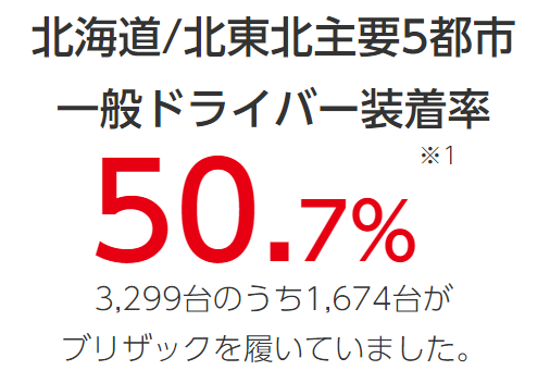 ※1 2022年1月~2月に、札幌市、旭川市、青森市、盛岡市、秋田市の5地区において、二段無作為抽出法により抽出された乗用車(含む軽)を保有している一般世帯を直接訪問して、乗用車の装着スタッドレス銘柄を調査。ブリヂストンタイヤソリューションジャパン株式会社が第三者の調査会社に委託して実施。