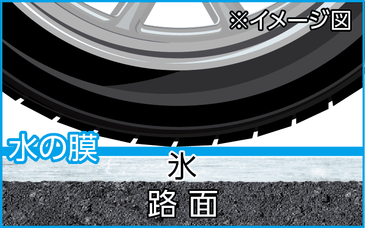 この水の膜が、氷とタイヤの間に入ってタイヤを滑らせます。