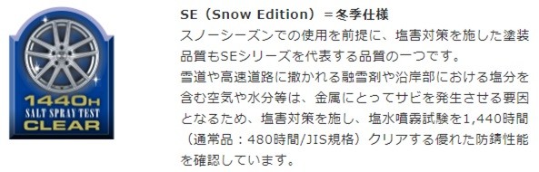 ここに紹介する「ECO FORME SE-20」と「BALMINUM DS-M」は、スノーシーズンの使用を考慮して開発されています。降雪地の道路では融雪剤がまかれることがありますが、これがホイールの劣化や腐食等の要因になります。ECO FORME SE-20とBALMINUM DS-Mは塩害対策を施すことで、塩水噴霧試験を1,440時間(通常品:480時間/JIS規格)クリアする優れた防錆性能を確認しています。