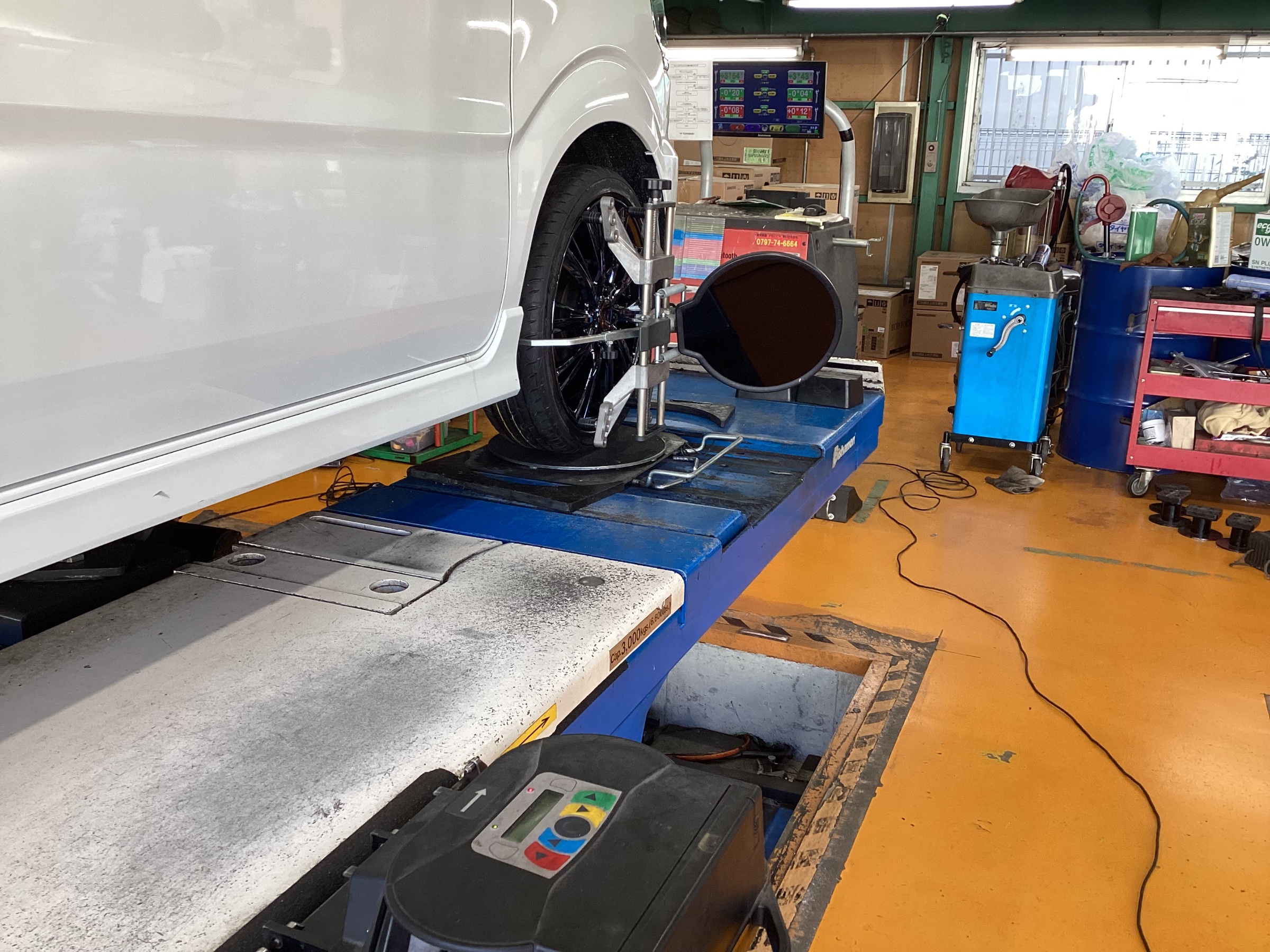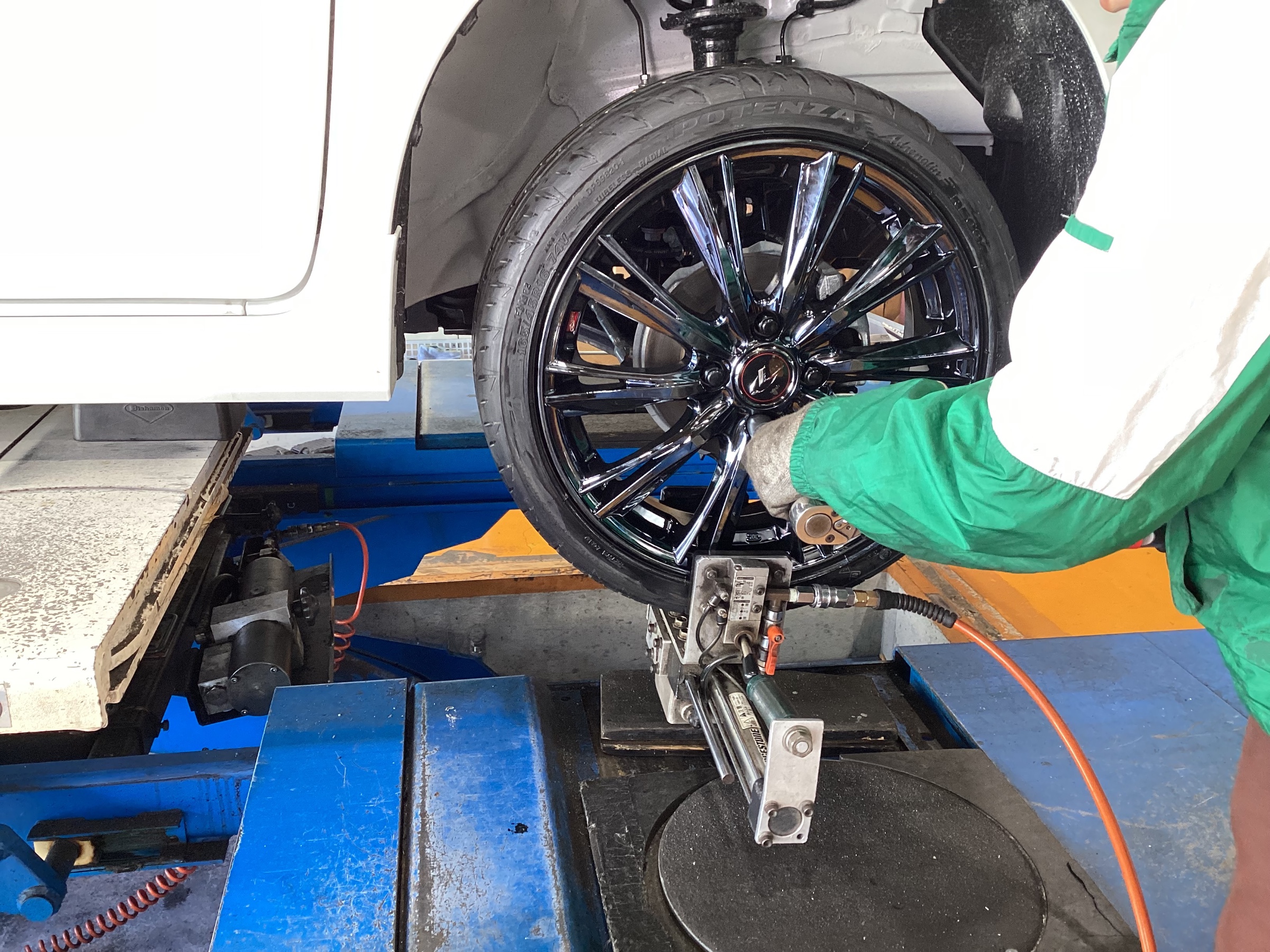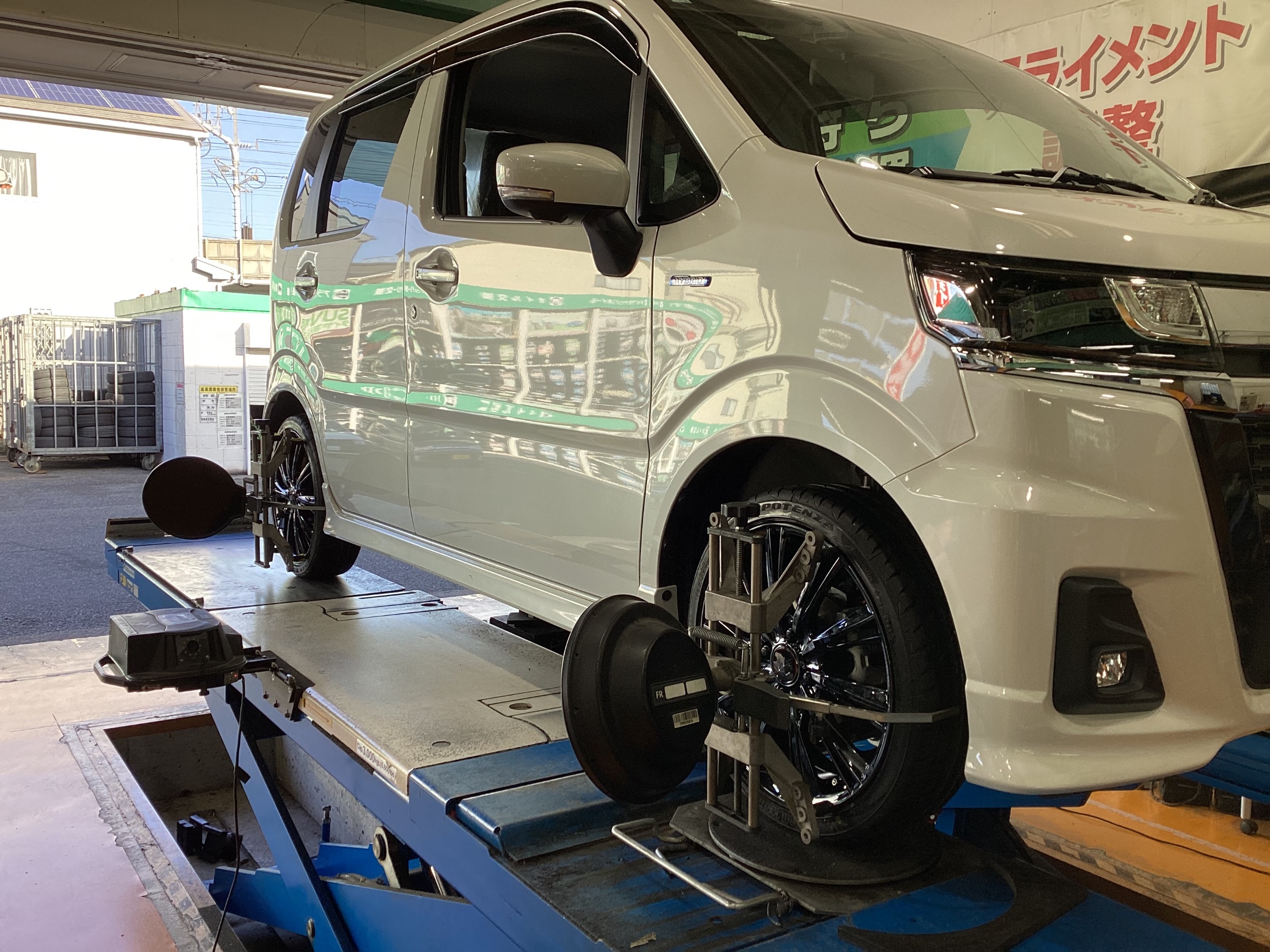 そしてタイヤホイールが装着が出来たら、アライメント調整でタイヤの取付角度を精密測定を実施