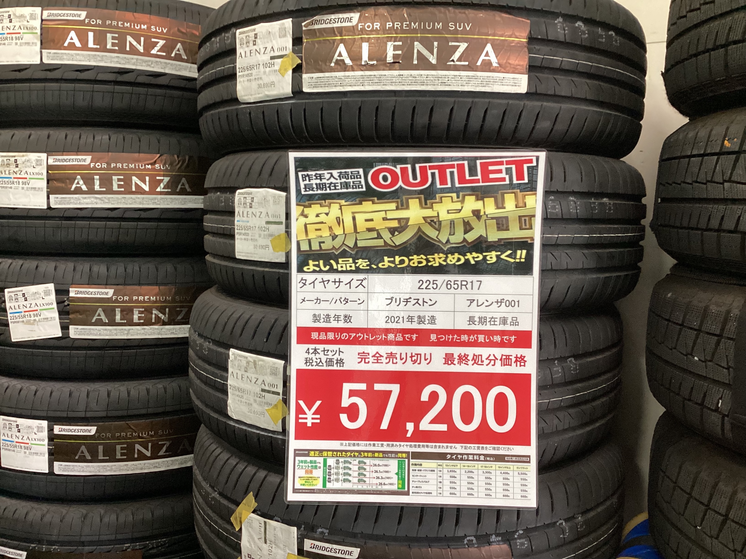 店頭のアウトレットタイヤコーナーに大量展示しています