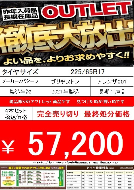 本日はブリヂストンのSUV専用タイヤ☆アレンザ001 225/65R17 102H が入荷しました