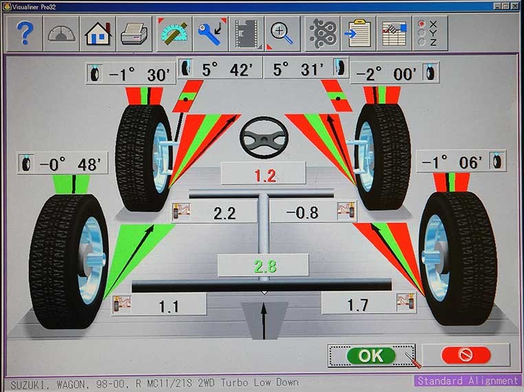 アライメント調整は各タイヤにセンサーを取り付けコンピュータで各角度を想定します