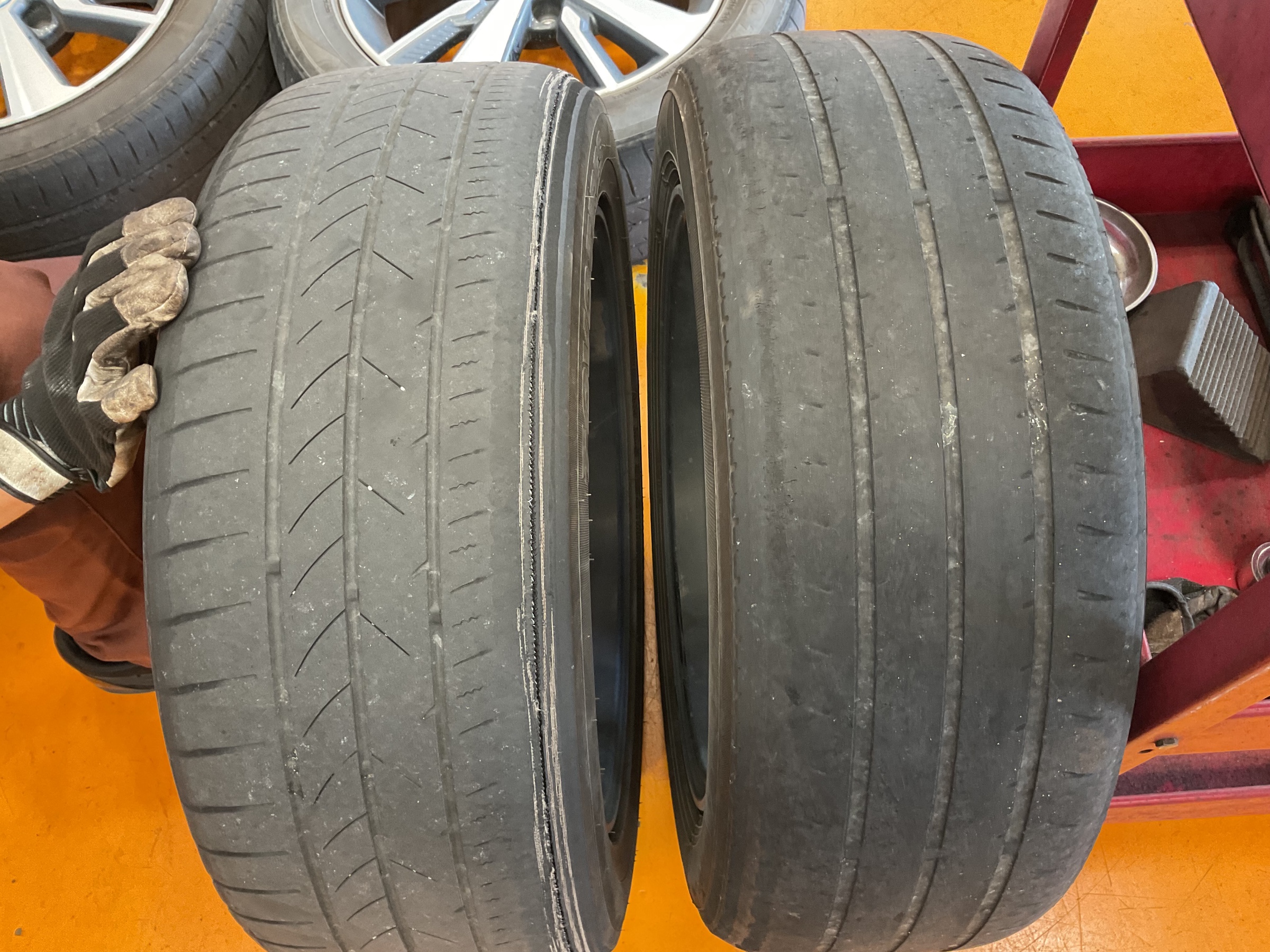 前輪の左右ともに偏摩耗(内減り)が発生していました