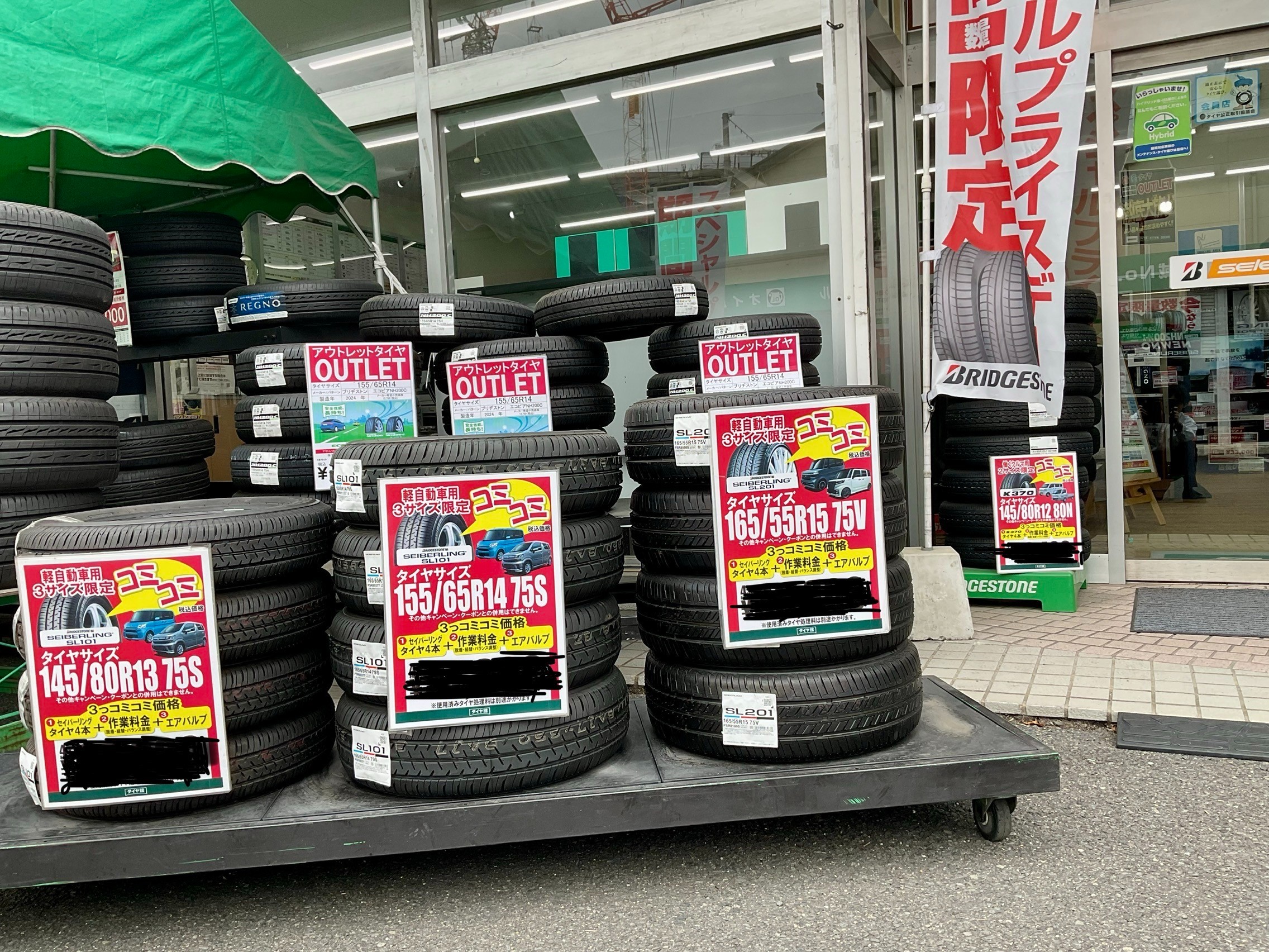 軽自動車に多い155/65R14や165/55R15その他一部サイズに関しましては、コミコミ価格キャンペーンで期間限定・台数限定アウトレット品が工賃込みの価格でお買い得となっております。詳しくは店頭にてご説明させていただきますので気になる方はぜひ一度ご来店お願いいたします。