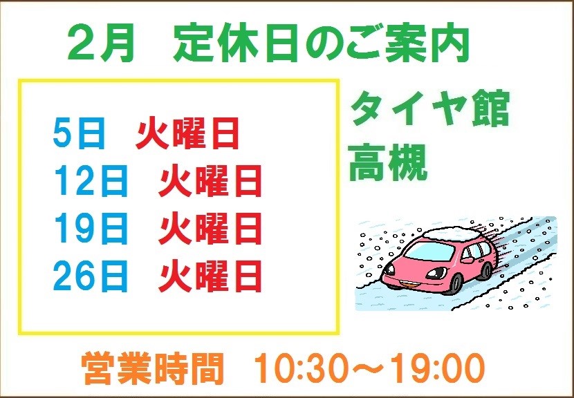 ☆2月のご案内☆ ポスト 2019年1月30日 タイヤ館高槻店WEBご覧頂きまして、ありがとうございます☆ タイヤ館高槻店 2月 定休日のご案内です♪ 通常通り、火曜日定休日となります♪(o ̄∇ ̄)/ まだまだ寒い日が続いておりますので スタッドレスタイヤ(冬タイヤ)をお持ちでない方は 在庫処分セール中のタイヤ館高槻店へ是非ご相談くださいませ<(_ _*)> 担当:たにぐち