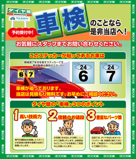 車検やってますよ~ “安心” 『タイヤ館車検』 ポスト 車検見積りでお困りの方。 タイヤ館では、車検の受け付けも行っております。 『いつもの所でえっかぁ』と言う前に当店の無料車検見積もりを 行なって、値段を比べてみてはいかがですか?? 見積もり時間は約15分です (混み具合により、待ち時間が出る場合があります) 見積もりは無料で実施しております!! お得なクーポンもありますので、是非一度ご来店ください。 ご不明な点はお気軽にスタッフまでお尋ねください。 カテゴリ:商品情報 その他商品・サービス