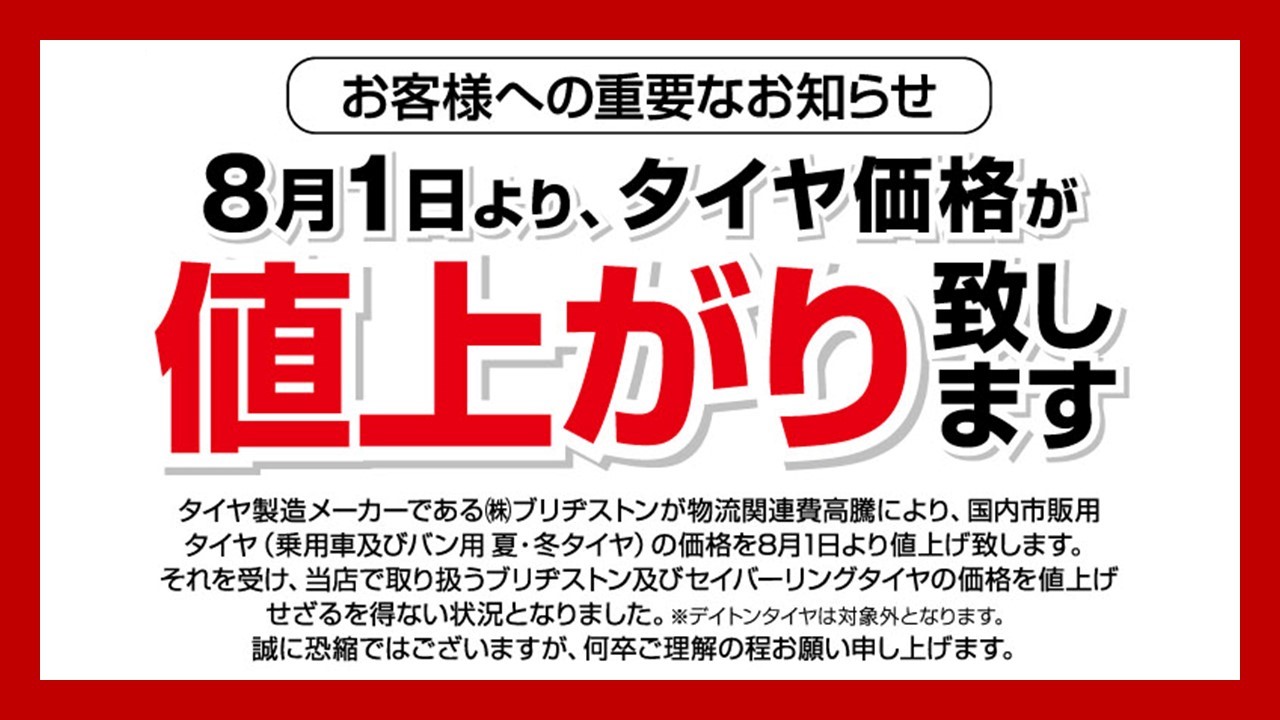☆タイヤ値上がりのお知らせ☆ ポスト 2019年6月14日 いつも当店のWEBをご覧頂きありがとうございます!! こんにちは!! よっしーです! 本日はお知らせのみとなりますがタイトルにもあるように 8月1日からブリヂストン製のタイヤが値上がりとなります。 誠に恐縮ではありますが何卒ご理解の程お願い申し上げます。 スタッフ一同心よりお待ちしております。 担当:よっしー