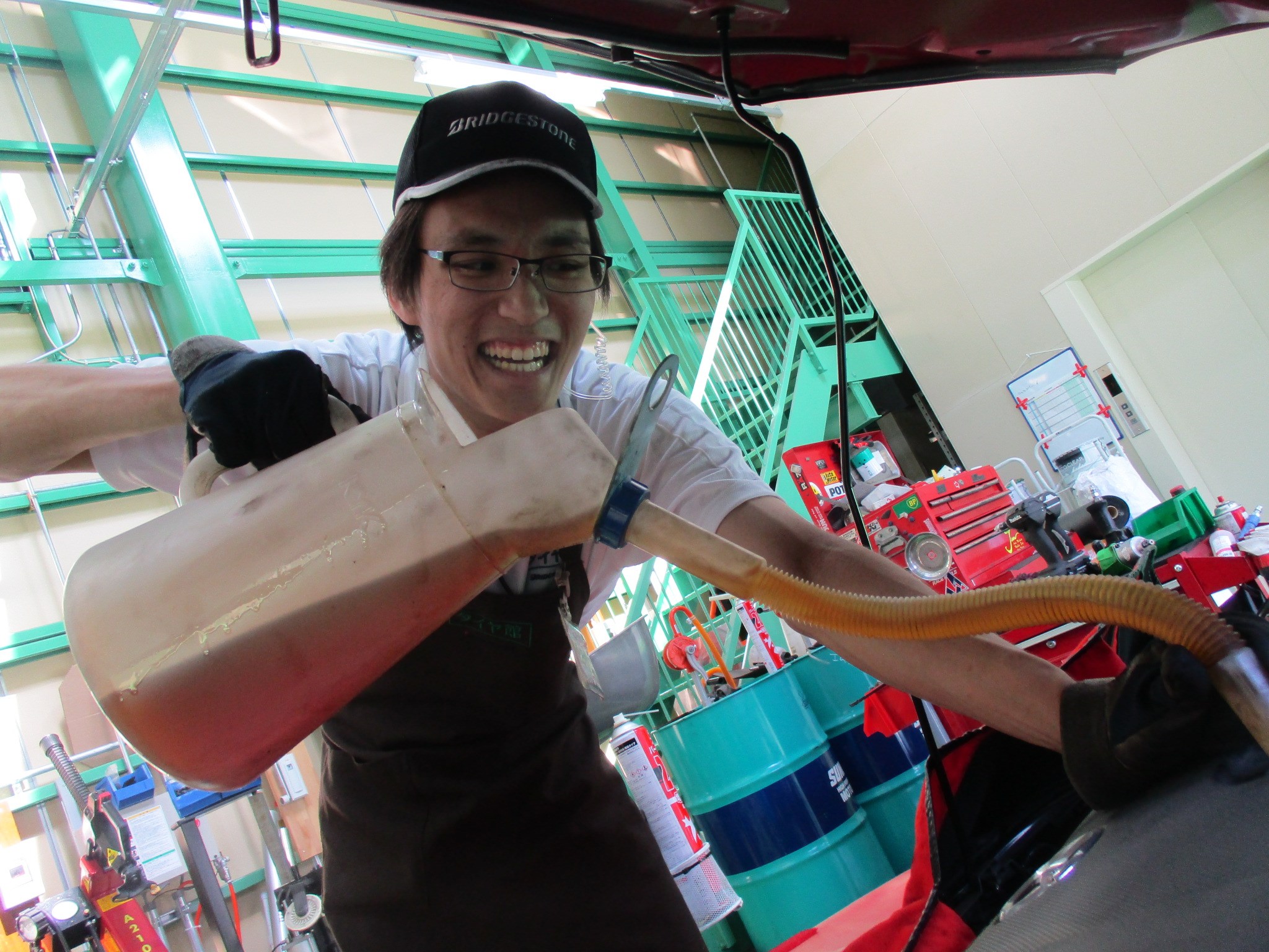 オイル交換作業時にはタイヤ空気圧点検やメンテナンス安全点検も実施しております!