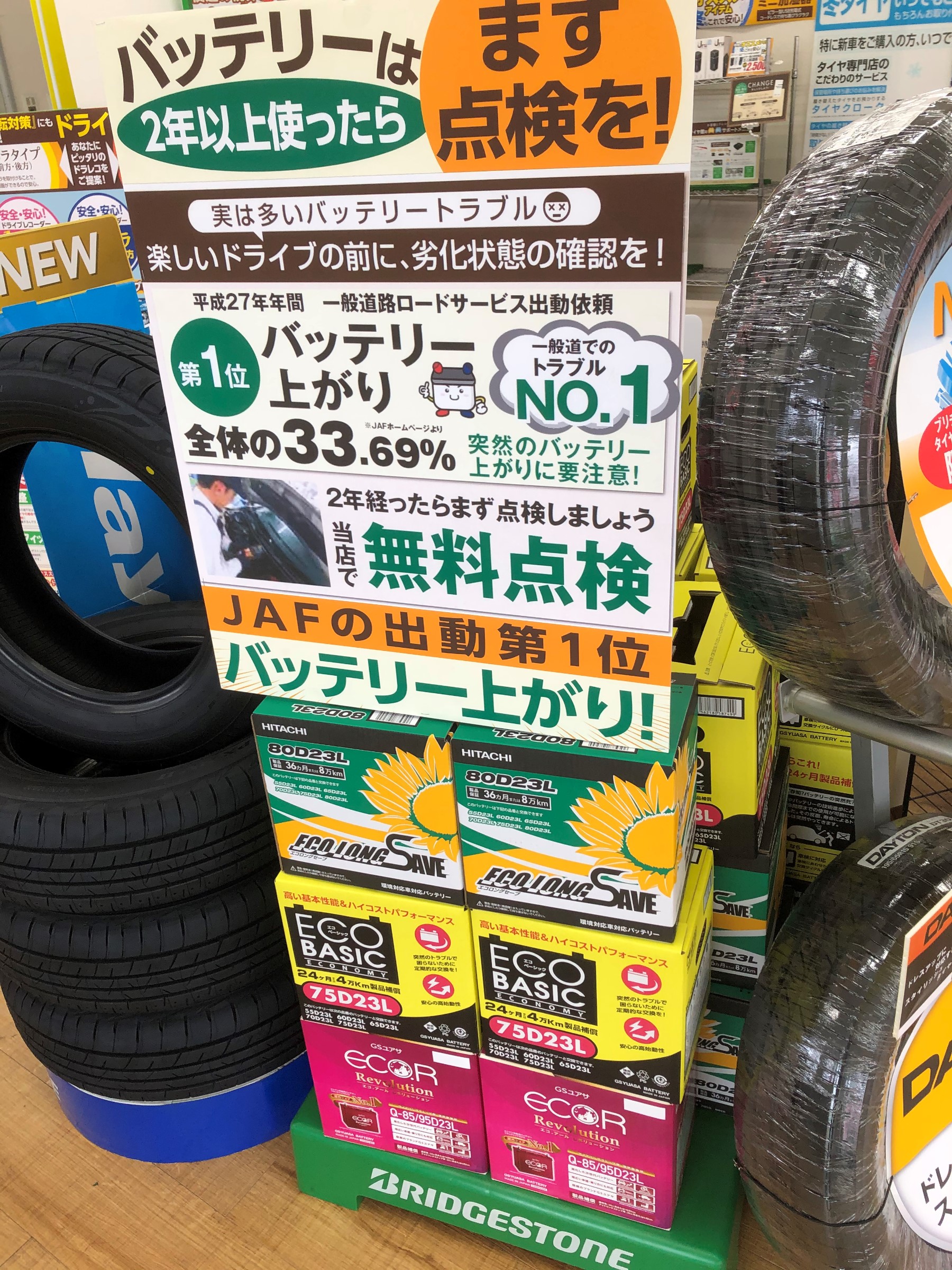 バッテリーの点検は無料で行っております、タイヤ館高槻は