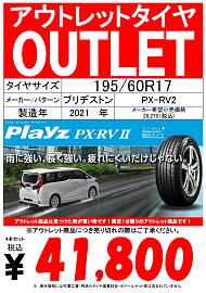 いつもタイヤ館高槻店の ホームページを ご覧頂き、ありがとうございます‼ Playz PX-RVⅡ 195/60R17 対応車種 トヨタ プリウス・プリウスPHV・ライズ etc... ダイハツ ロッキー etc... スバル レックス etc... アウトレットタイヤを集めて お買い得価格にて ご提供しています。 アウトレットタイヤは...