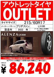 いつもタイヤ館高槻店の ホームページを ご覧頂き、ありがとうございます‼ ALENZA LX100 215/60R17 対応車種 トヨタ C-HR etc... ニッサン エクストレイル・デュアリス etc... ホンダ CR-V etc... マツダ MPV etc... アウトレットタイヤを集めて お買い得価格にて ご提供しています。 アウトレット...