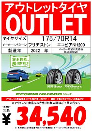 いつもタイヤ館高槻店の ホームページを ご覧頂き、ありがとうございます‼ ECOPIA NH200 175/70R14 対応車種 トヨタ ヴィッツ・カローラ・シエンタ etc... ニッサン ウイングロード etc... ホンダ フィット etc... スバル インプレッサ etc... アウトレットタイヤを集めて お買い得価格にて ご提供...