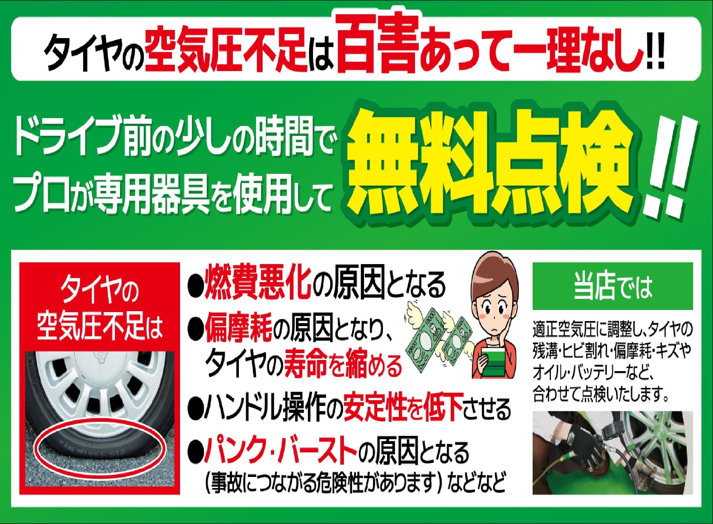 記事一覧 いざっ!ゴールデンウィークのお出かけ前の点検もお忘れなく・・・ いつもタイヤ館高槻のホームページをご覧いただきありがとうございますもうすぐゴールデンウィークですねお出かけ先は決まりましたか? お出かけ前にタイヤの空気圧は必ず点検しましょう~ せっかくのゴールデンウィークです お出かけ先や道中でトラブルにならない様にちゃんと点検してからのお出か... 2026年4月18日 ポスト