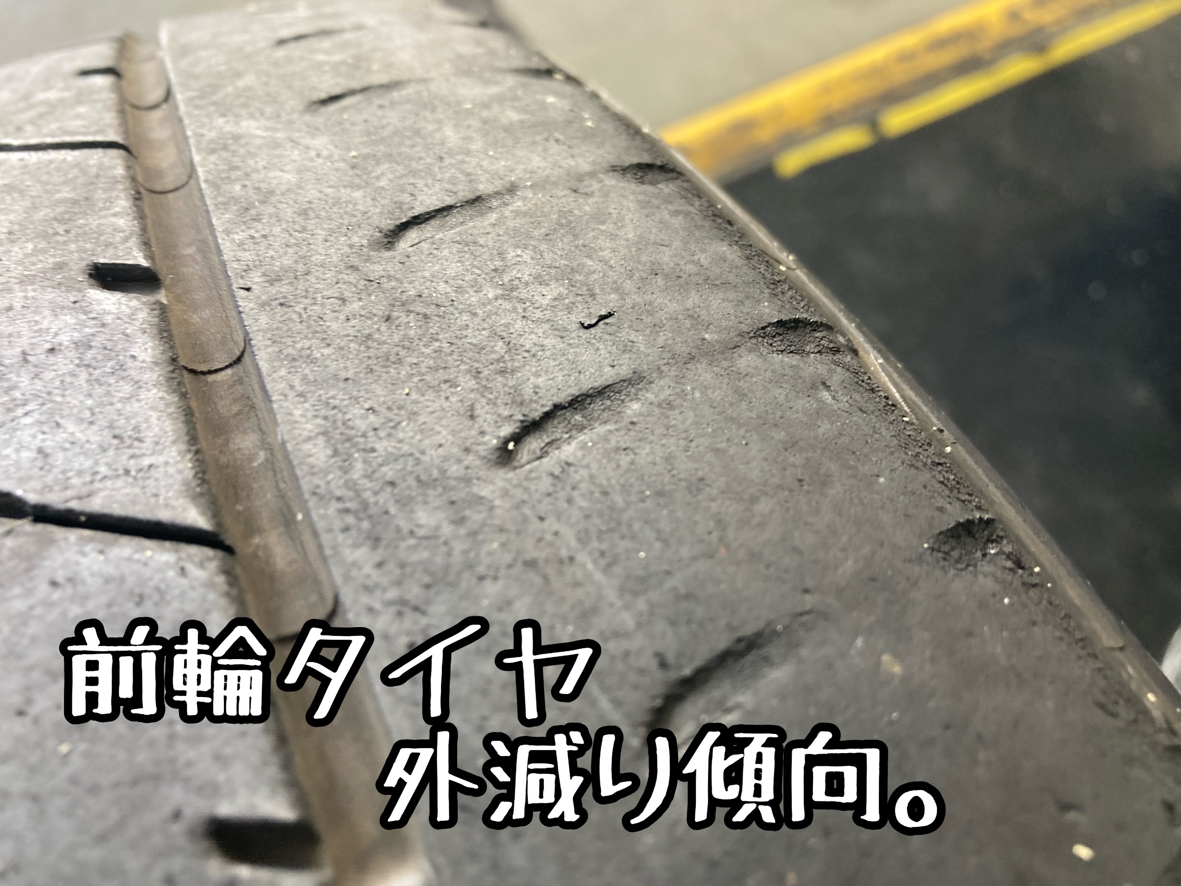 前輪に限っては外側から内側にかけて摩耗が目立つ状況。
