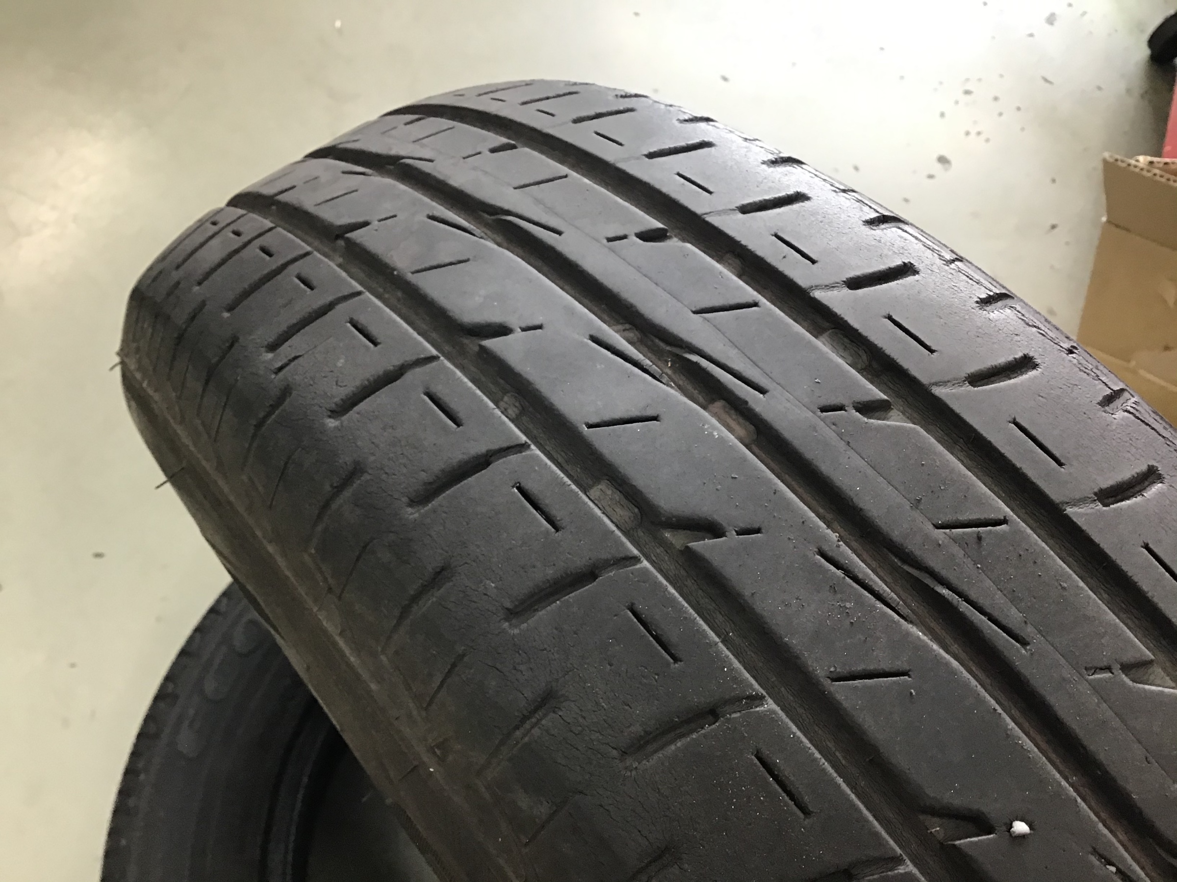こちらが外したタイヤ。溝はまだありますが、ゴムが経年劣化しておりました。