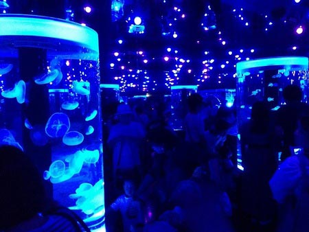 水槽背面がスクリーンで映像の中を泳いでたり♪