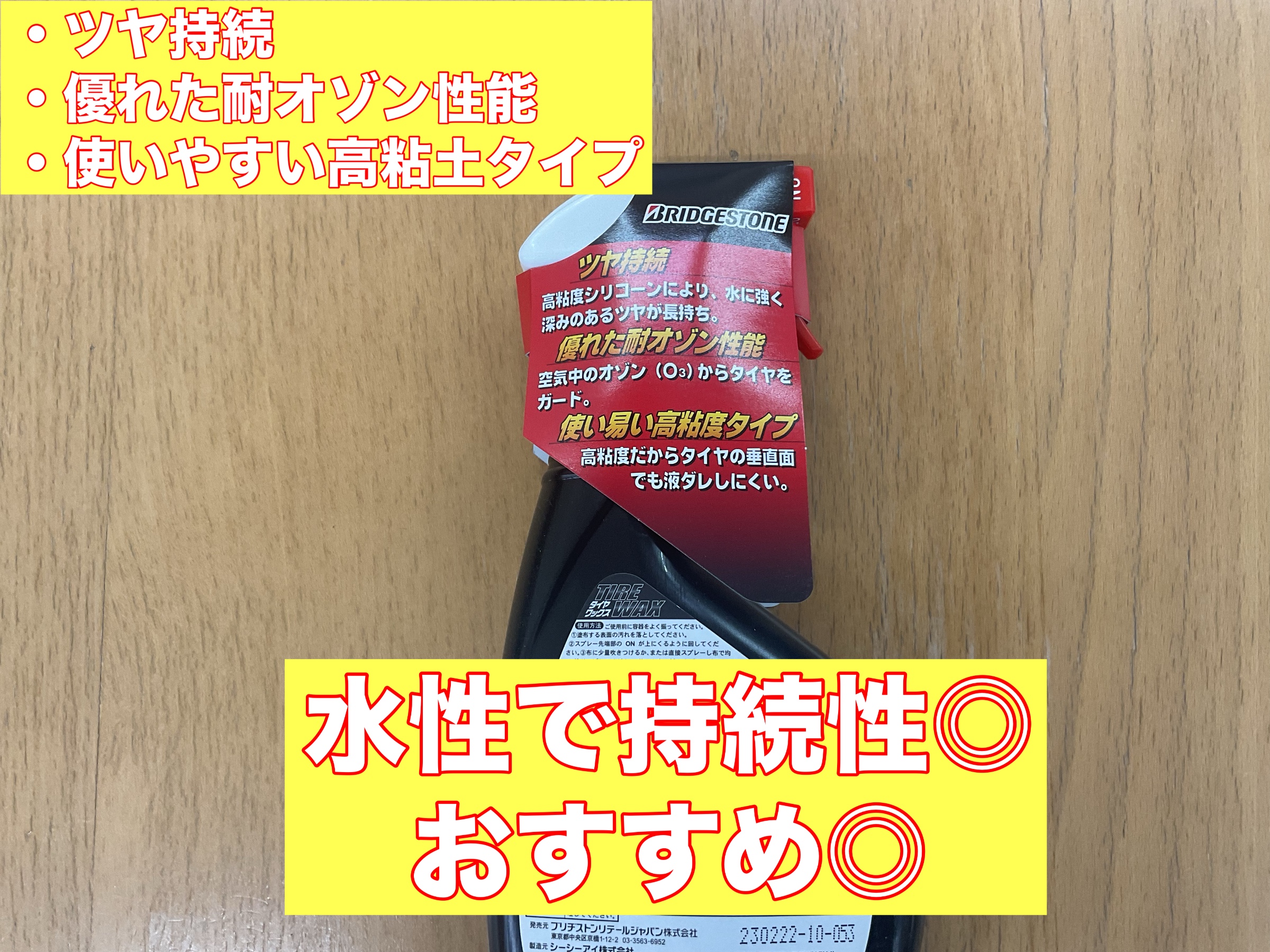 『BRIDGESTONE』タイヤワックス ポスト 2025年2月28日 今回は、『BRIDGESTONE タイヤワックス』の紹介 お客様からBRIDGESTONEのタイヤワックス良いの?どうなの?とお問合せがございます。 →水性ワックスで持続力もあり、おすすめです。 特に、油性(ワックス)でタイヤに悪影響があると嫌だ。 持続力が良いものがいいな。 という方におすすめです☆ 使ってみないとわからないですよね、、、 当店では、作業をさせていただくとお返し時にBRIDGESTONEのタイヤワックスを塗り、お客様へお返しをさせていただいております。 (状況によっては、タイヤワックスを塗らないでお返しさせていただく場合がございます。ご希望の場合は、受付時にスタッフにタイヤワックスご希望旨お伝えお願いいたします。) 1度使用してみてご検討するのもありですよね。 是非お問合せお待ちしております♪ カテゴリ:タイヤ関連 その他メンテナンス 商品情報
