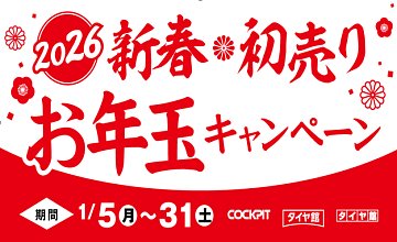 旧年中はコクピット・タイヤ館をご利用いただき、誠にありがとうございました。 本年もお客様の安全・安心なカーライフの為、一層努力してまいりますので、 引き続き宜しくお願い申し上げます。 いつもコクピット・タイヤ館をご愛顧いただいているアプリ会員様限定で 新春初売りお年玉キャンペーン...