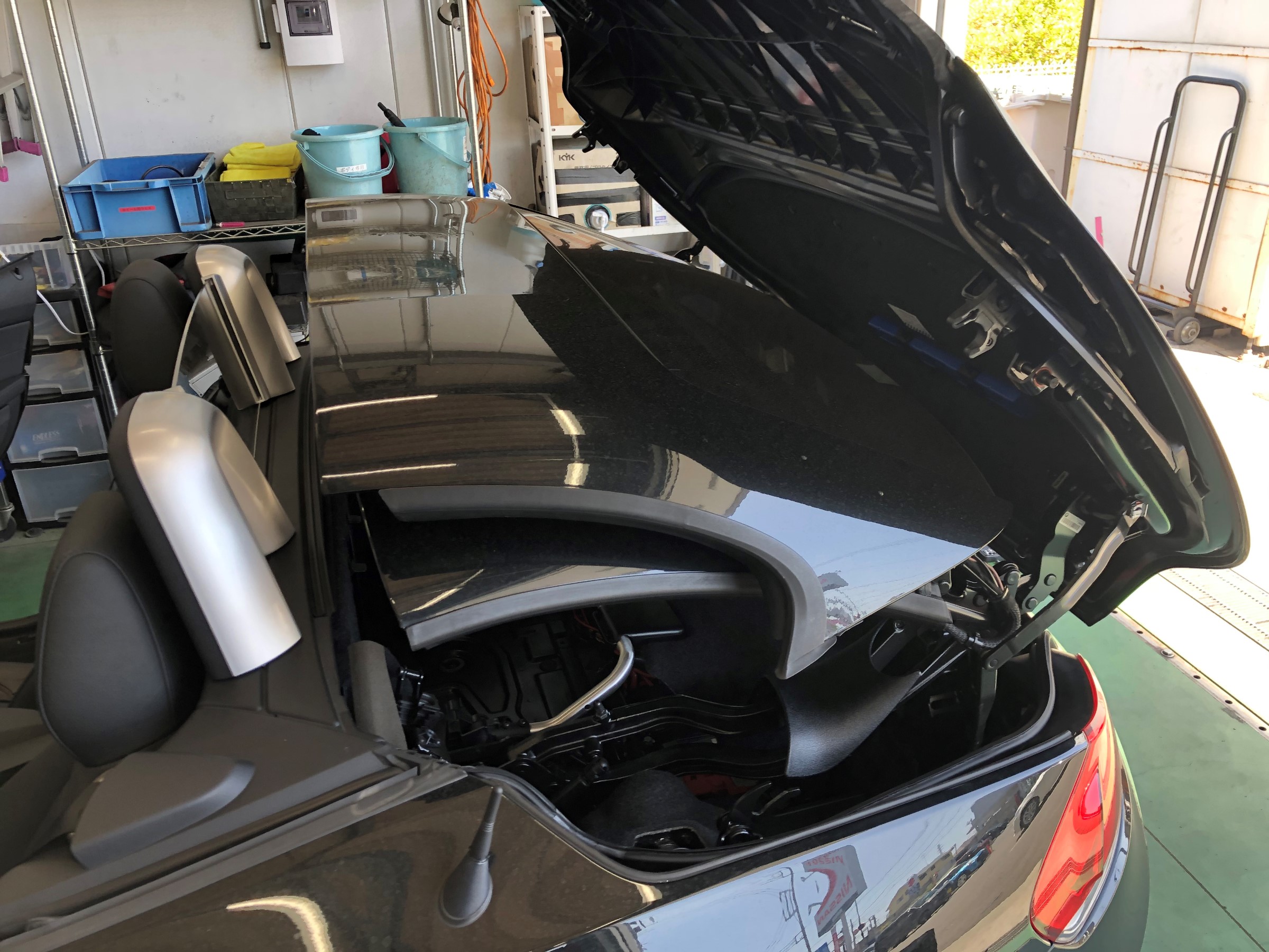 通常であれば内装を外し配線しますがハードトップを開け閉めや途中で止めたりしないと外せなかったのでスタッフの手を借りて丁度いい所で止めてもらい内装外しも終了!