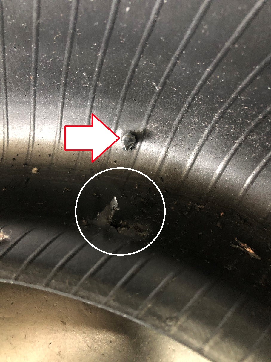 矢印部分が刺さったビスの先端です。空気圧が低いまま走行してしまい〇印部分の側面内側がえぐれてしまっている事が分かります。