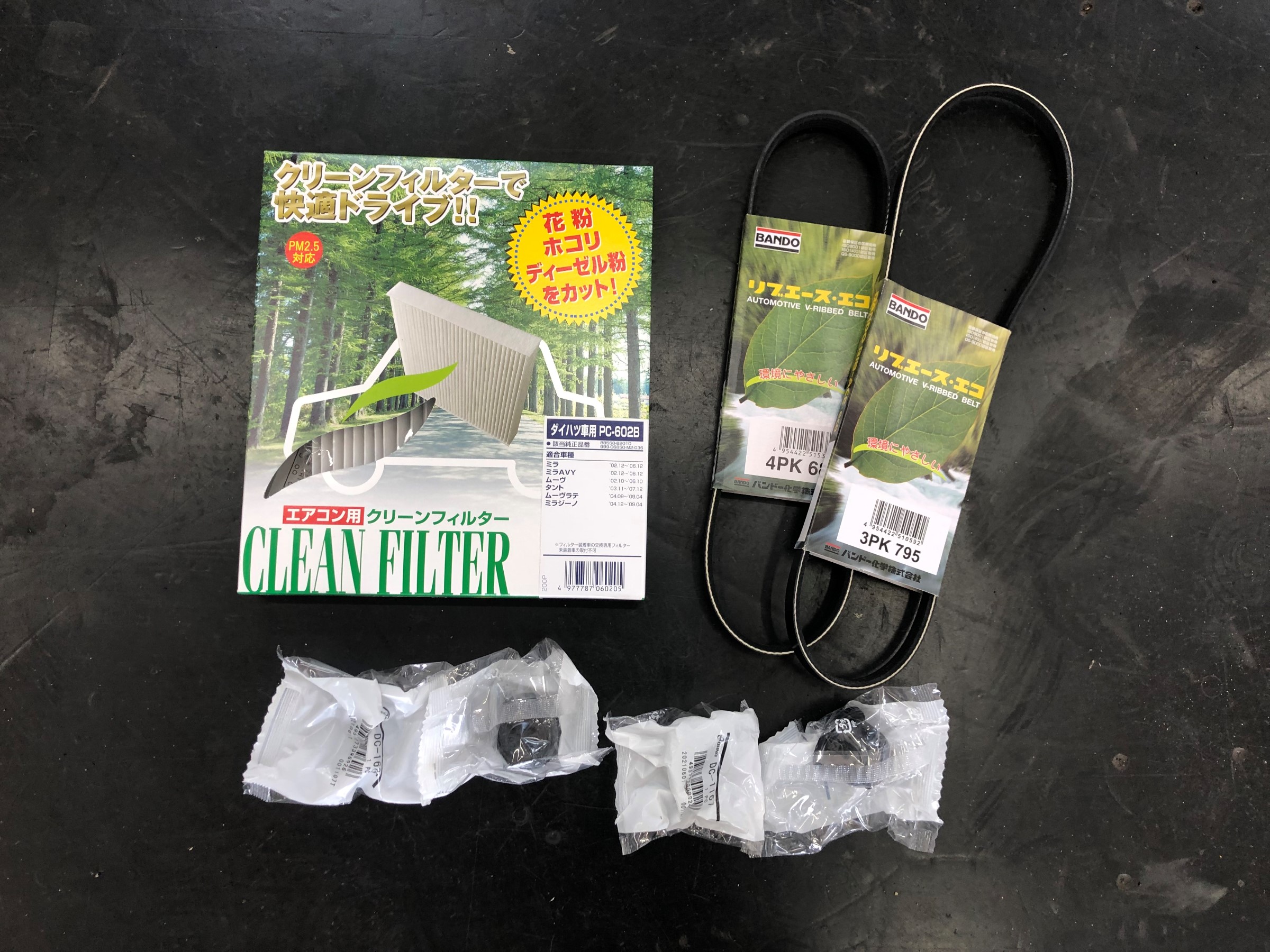 交換部品:オイル、オイルエレメント、エアコンフィルター交換、タイロッドエンドブーツ左右、ロアボールジョイントブーツ左右、発煙筒(期限切れ)、ステアリングラックブーツ、オルタネーターベルト、クーラーベルト