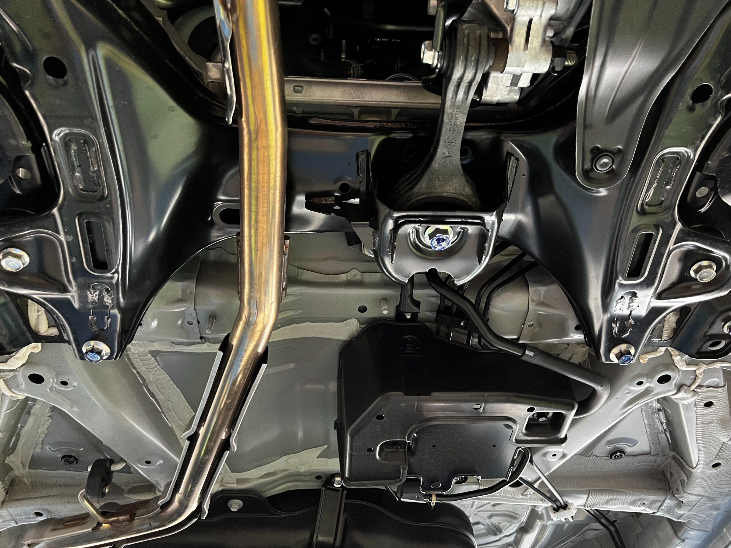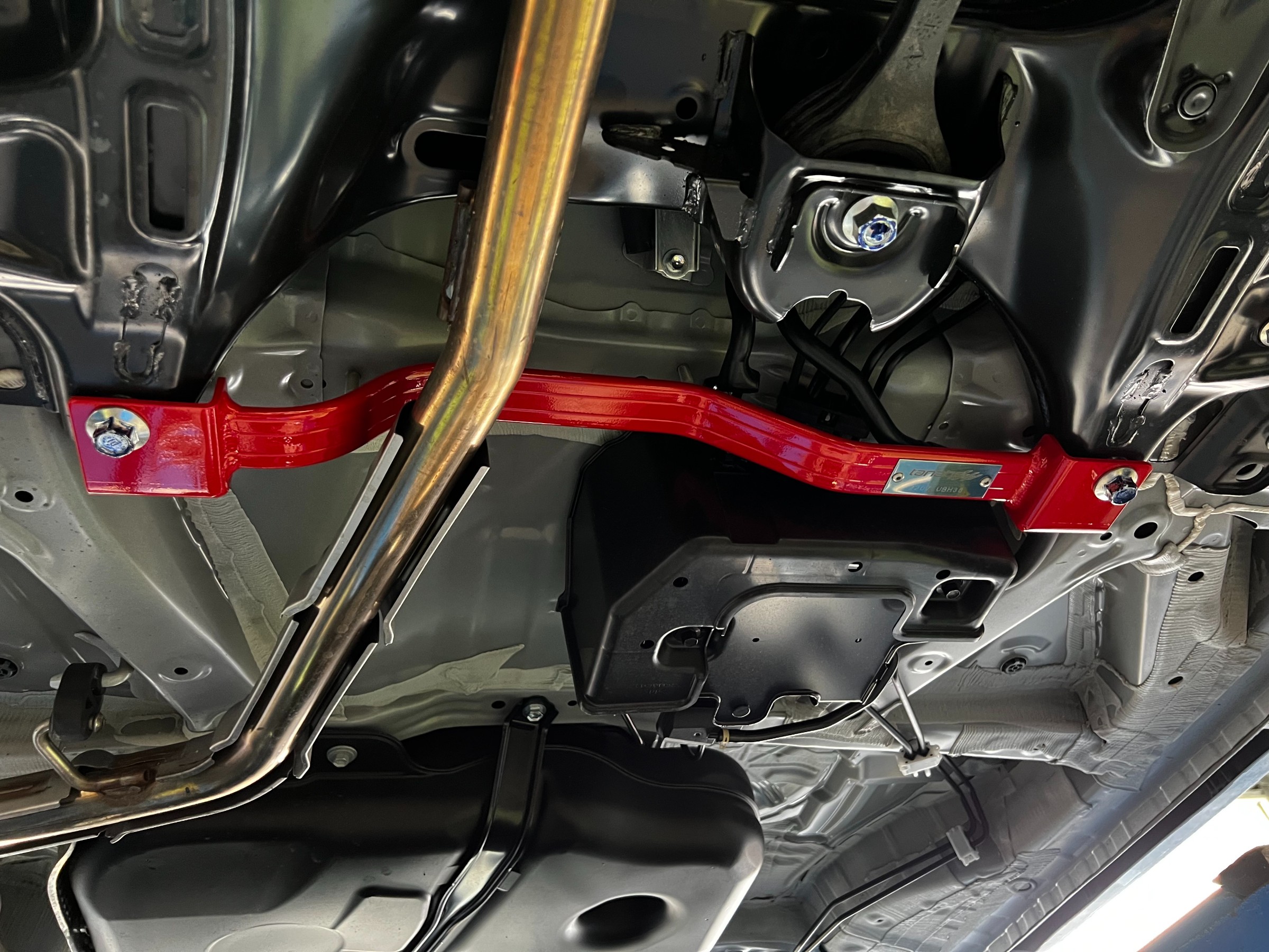 ■ロワアーム支持部を連結して、ボディ剛性をアップ。コーナリング時のボディのネジレを抑える。