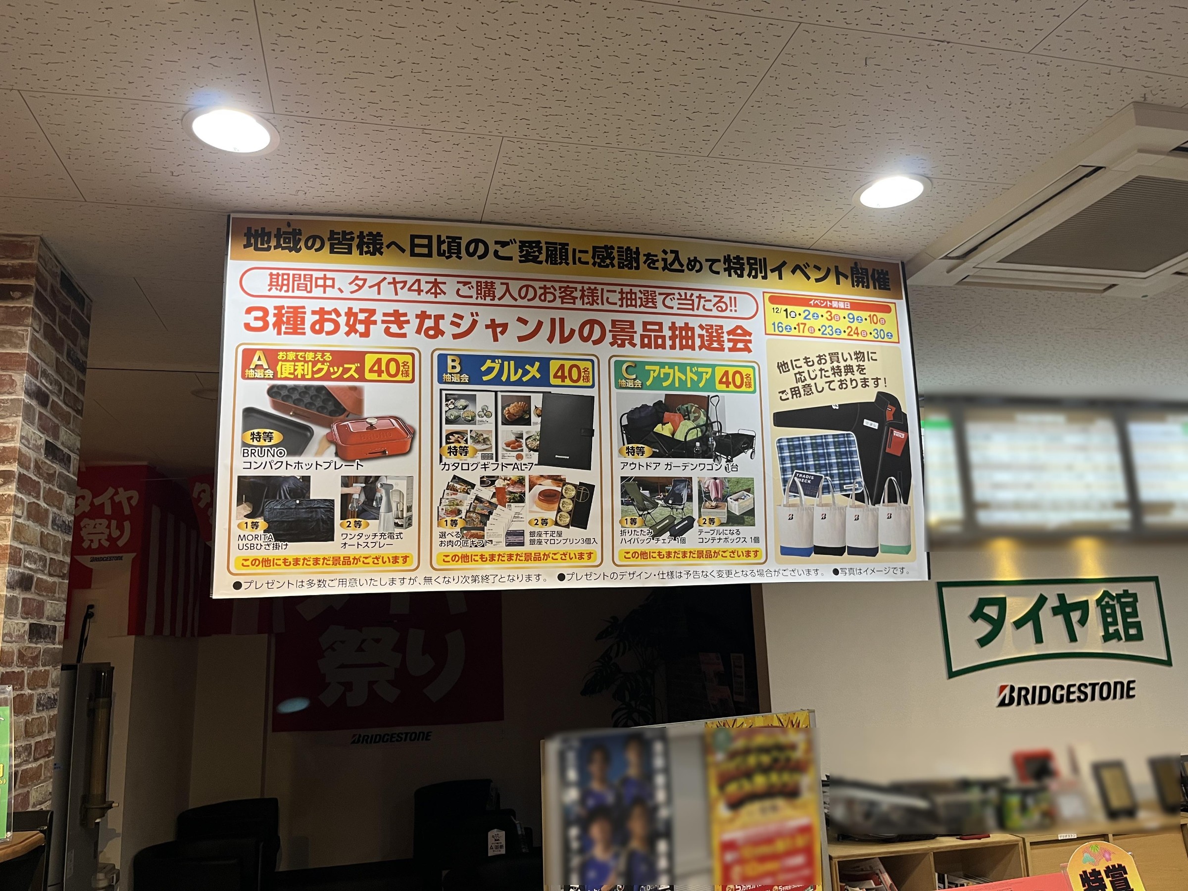 タイヤ4本お買い上げでお好きなジャンルの景品抽選会もあります。