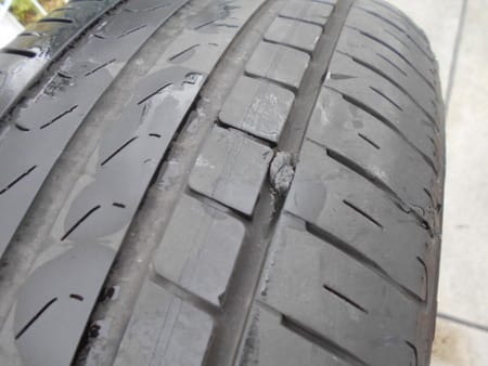 タイヤの内側のサイド部分が断裂状態。まさにバースト寸前。