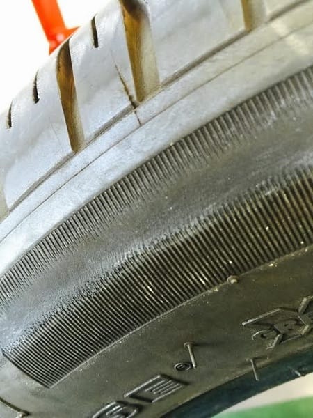 ビスが刺さり、パンクをし、そのまま気が付けず走行してしまい、タイヤのサイドに引きずり跡が見受けられ