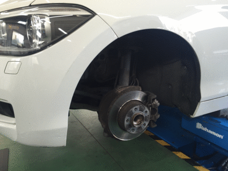 本日は、BMW 116i (F20)のフロントブレーキパッドの交換を行いました。
