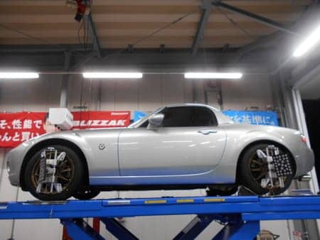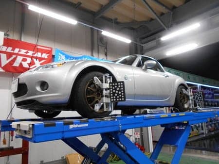 ロードスターと購入したてのホイールに当店のPOTENZA RE003を装着からのホイールアライメント。完璧。正に完璧です!!ロードスターかっこいいですね(*ノωノ)